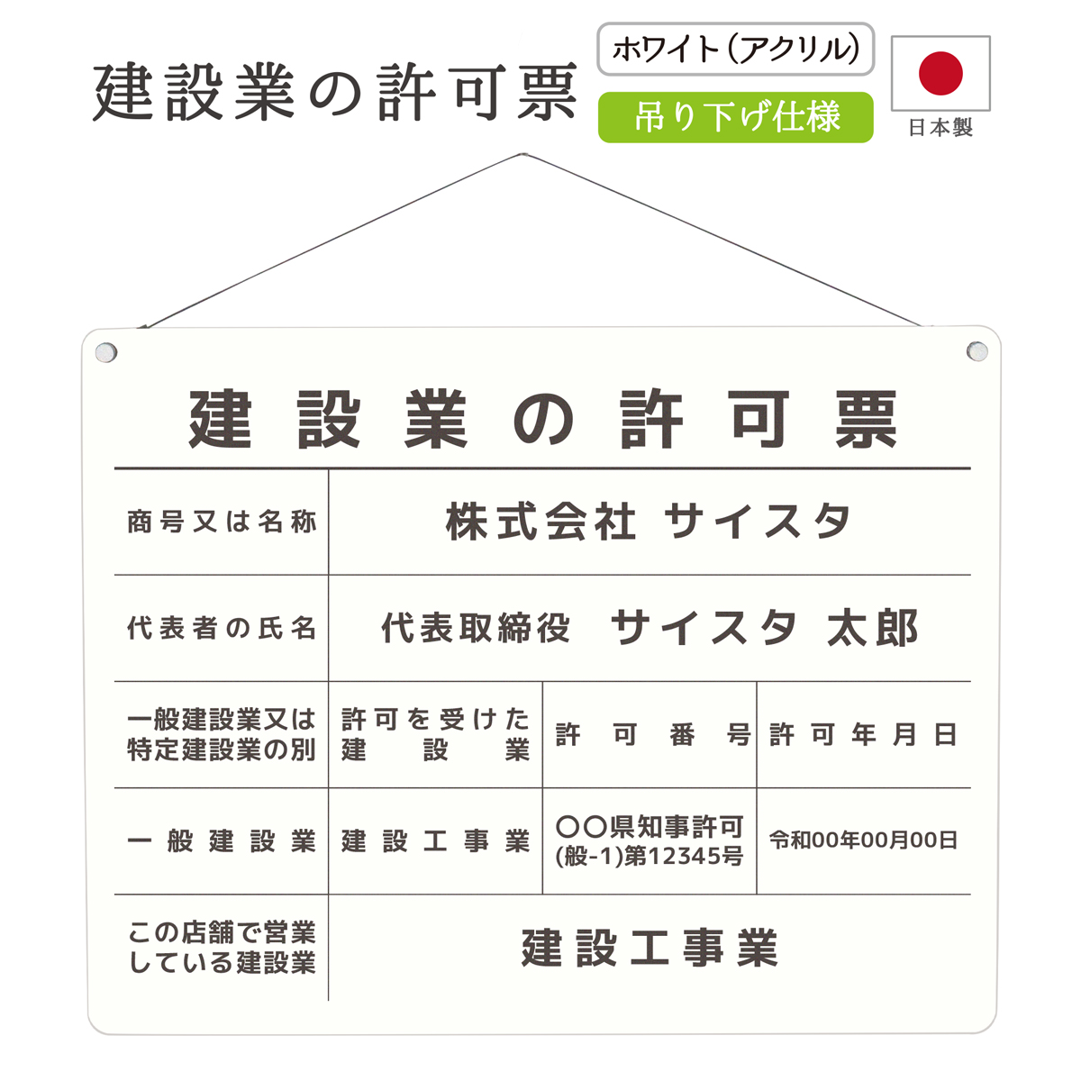 建設業の許可票 吊り下げ 看板 法令サイズ 建設業 許可票 建設業許可票 アクリル おしゃれ 白 不透明 シンプル 吊し|デザイン:A003 ホワイト