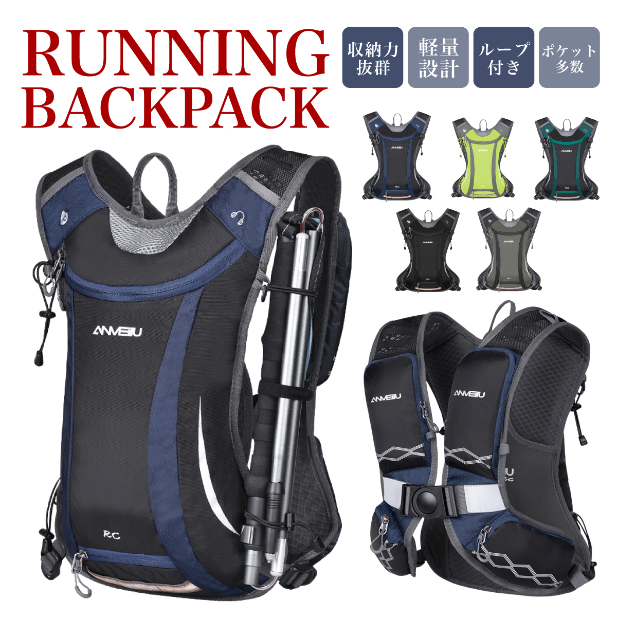 他装備:ヘルメット固定ネット内臓、トレッキングポール固定用ゴム、スマホ収納ポケット、補給食収納ポケット、ワンタッチベルト、背面クッション