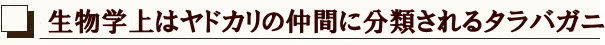 ![]() 生物学上はヤドカリの仲間に分類されます | タラバガニ(鱈場蟹)は、タラバガニ科に属する甲殻類の一種で、「カニ」の名がついてはいても、生物学上はヤドカリの仲間に分類されます。 日本海、オホーツク海、北太平洋とアラスカ沿岸などに広く分布し、重要な水産資源となっています。 生息域がタラの漁場(鱈場[たらば])と重なるため、「鱈場蟹」と呼ばれ、その名がそのまま和名となりました。 |