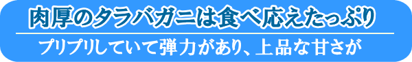 日本の主な漁場はオホーツク近海で、沖合底引き網や刺し網で漁獲されますが、現在では、乱獲によって生息数が激減しています。 このため、国内で流通するタラバガニのほとんどは、ロシアやアメリカ(アラスカ)から輸入されたものです。 タラバガニの魅力といえば、なんといっても肉厚な身にあります。 プリプリとした身には、上品な旨味と甘みがあります。 | ![]() 肉厚の身は食べ応えも十分です |