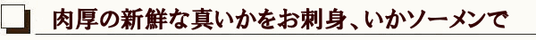 ![]() いか刺し、いかソーメンで味わってください | 北海道でマイカ漁が始まるのは6月ですが、漁の初期は「ムギイカ」と呼ばれる小さいマイカがほとんどで、8月を迎えると体型が大きくなり、身も肉厚になります。 水揚げされたマイカの用途は広く、刺身用のむき身やイカソーメン、いかめし等に利用されるほか、スルメや一夜干し、塩辛などの生珍味などに加工されます。 |