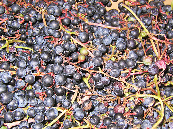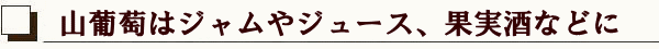 ヤマブドウは、生食のほか、ジャムやジュース、果実酒などに利用されますが、果実酒(ヤマブドウ酒)は、年配の人々にとっては、懐かしい味覚のひとつです。 近年、ワインの原料としても注目されており、他のブドウ品種との交配など、品種改良も試みられ、日本の在来種として見直す動きがあります。 | ![]() ワインの原料としても注目されています |