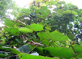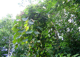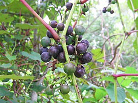 ![]() 森に入らなければ採取することはできません | ヤマブドウは、雌雄異株で、雌株だけが実をつけるため、林の中でヤマブドウの木を見つけても、ほとんどの木には、実をつけていません。 実は酸味が強く、種子が大きいため、生で食べるには、あまり適しませんが、晩秋、霜が降りる頃になると、糖度を増して甘酸っぱくなり、生のままでも美味しく食べることができます。 |