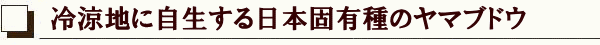 ヤマブドウは、ブドウ科のツル性植物で、冷涼地に自生する日本固有の野生種です。 山の斜面などの、林の中の樹木に巻きついて成長し、高い位置に実を結ぶため、採取が難しい野生の果実です。 初夏の6月に黄緑色の小花を開花し、受粉すると小さな球形の実をつけ、晩秋に熟して黒紫色になります。 | ![]() 高い位置に実を結ぶ野生のヤマブドウ |