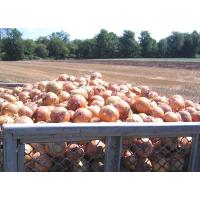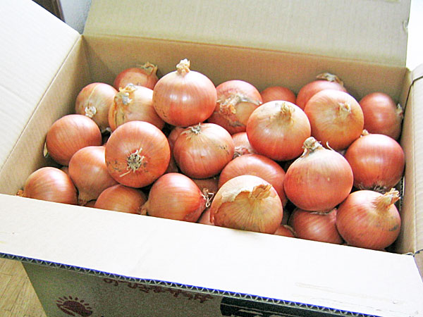 熱を通すと甘みが出るタマネギは、どんな料理にも使える便利な野菜です。 タマネギの収穫は、8月のお盆前後から始まり、9月末までには終了します。 収穫後は、大型のコンテナに入れて、畑で風乾後、専用の定温庫に保存します。 出荷は、翌年春まで続き、全国各地へと送られていきます。 | ![]() 8月のお盆前後から始まる玉ねぎの収穫 |