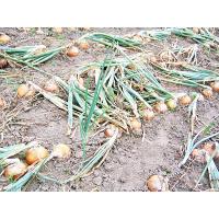 また、ビタミンB群や食物繊維なども豊富に含まれています。 このように、硫化アリルを豊富に含む玉葱は、健康食品でもあるのです。 この硫化アリルは加熱すると甘味に変わりますが、辛味が強く、香りがきつい玉ねぎほど甘くなり、これらの効用も高いのです。 | ![]() 収穫期を迎えたタマネギ畑(8月下旬) |