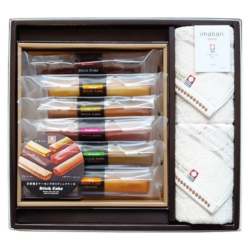 【内容】フェイスタオル(34×80cm)×2、スティックケーキ(プレーン・チョコ・ラズベリー・ブルーベリー・チーズ・ピスタチオ・レモンティ)×各1