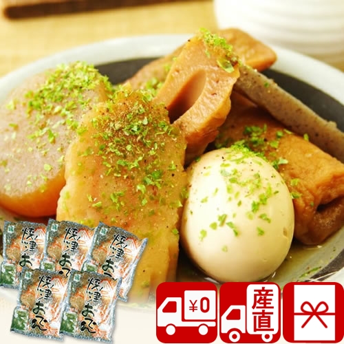 【内容】焼津おでん(360g)(大根・卵・黒はんぺん・なると巻・ごぼう巻・煮込みちくわ・こんにゃく)×5、だし粉×5