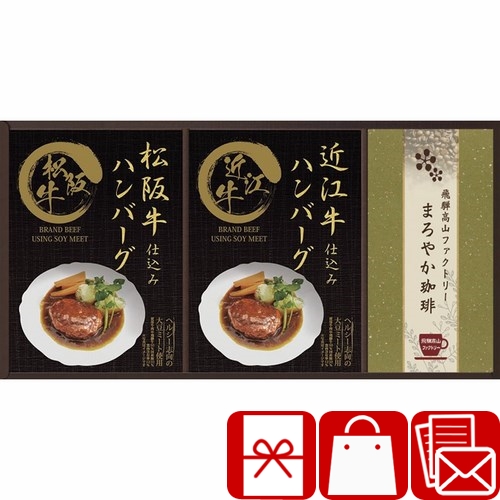 【内容】飛騨高山ファクトリードリップ珈琲(まろやか)×3、松阪牛仕込みハンバーグ(大豆ミート入り)・近江牛仕込みハンバーグ(大豆ミート入り)(各130g)×各1