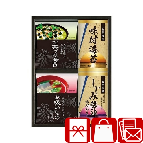 【内容】永谷園お茶づけ海苔(4.7g×5袋)・永谷園お吸いもの松茸風味(2.3g×6袋)・有明海産味付海苔・しじみ醤油味付海苔(各10切20枚)×各1