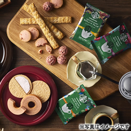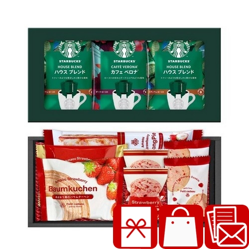 【内容】スターバックスオリガミドリップコーヒー(ハウスブレンド9g×3・カフェベロナ9g×2)、あまおう苺ロングスティックパイ、あまおう苺バウムクーヘン、あまおう苺ゴーフレット、焼きほろろイチゴクッキー×2、ストロベリーチョコクランチ×2