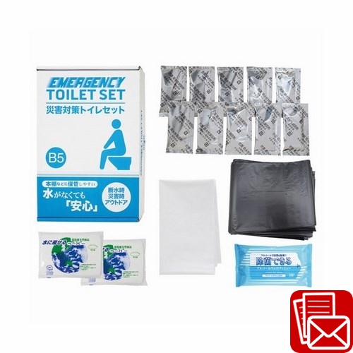 コンパクトに備蓄可能なトイレ処理キット。B5ファイルボックスサイズで棚や引き出しに常備しやすい。断水時にも便座に袋をセットし、使用後に凝固剤を振りかけるだけで排泄物の処理が可能。可燃ごみとして廃棄できます。