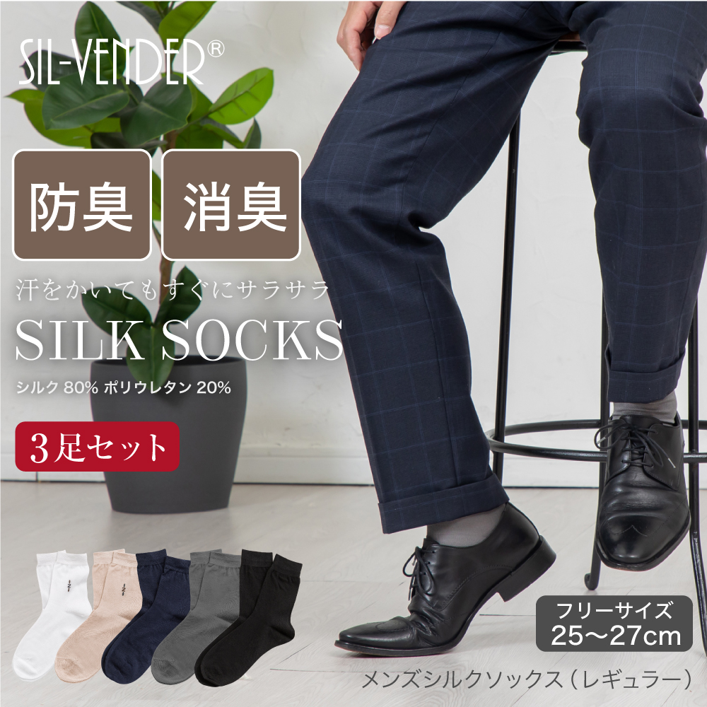 靴下 シルクソックス 3足セット メンズ 25-27cm メール便送料無料 シルク 防臭 消臭 抗菌 革靴 スニーカー スーツ ビジネス silk