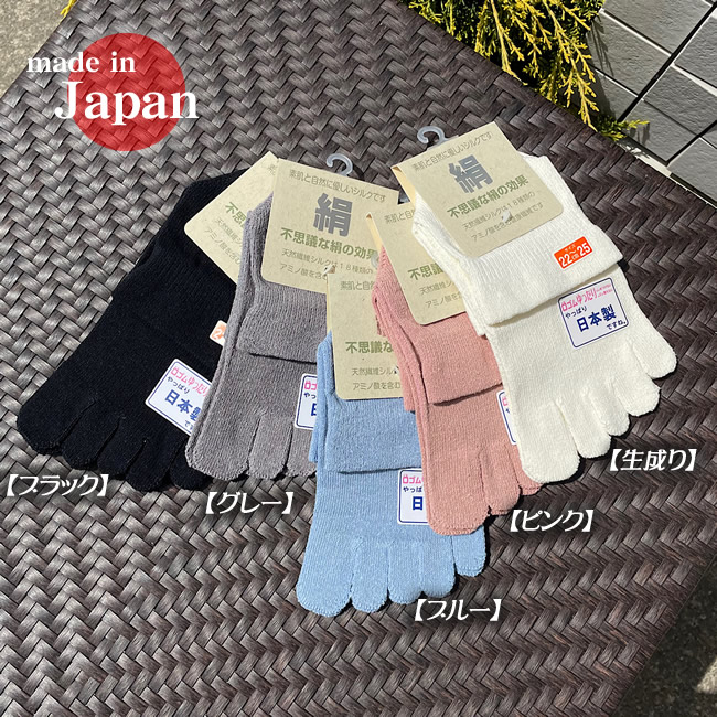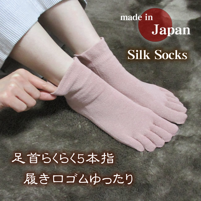 ■特 長 絹のアミノ酸効果でお肌を健康な状態に保つ健康 ソックスです。 シルクは冬温かく夏涼しく!抗菌・防臭効果 (足がにおわない)があり、優れた通気性(蒸れない)もあります。 お試し価格でお求め安い価格設定で御座います。この絹ソックスは 絹紬糸使用シルクノイル(ざらざらした感じ)を使用しております。 お手持ちのソックスと重ね履きして頂けますと尚効果的です。 新発売 足首を締め付けない はき口&全体もゆったりタイプ (日本製) ■シルクノイルとは・・・■ 一粒の繭からとれる糸(生糸)は1000m以上にもおよぶ長繊維ですが、 生糸にできない繭は、綿状にして紡いだ糸(紡績糸)にします。 比較的長い繊維のものを「絹紡糸(けんぼうし)」といい、やわらかな 光沢を持つふくらみのある糸になります。一方、4cm以下の短い繊維 のものを 「絹紡紬糸(けんぼうちゅうし)」といい表面が少しザラザラした 糸になります。 これで織った生地がシルクノイルです。ともに紡績した糸ですので、 空気を含み、 吸湿性、放湿性、保温性に優れています。特にシルク ノイルは、通常の生糸製品と違い、 わたのような仕上がりで、空気の 保有量も多く、絹本来の保温性吸湿性にも富んでいます。 ただし、磨耗に弱いので、お洗濯により糸やせがおこってしまいます。 お洗濯の際は色の濃いものと一緒に洗うと、絹糸が濃い品について しまいますので、 ご注意ください。(洗濯ネットをご使用ください) | ☆.゜,.,;°♪。,,.;‘☆.゜,.,;°♪。,,.;‘☆.゜,.,;°♪。,,.;‘☆.゜,.,;°♪☆.゜,.,;°♪。,,.;‘☆.゜,.,;°♪。,,.;‘☆.゜,.,;°♪。,,.;‘☆.゜,.,;°♪ 〜お客様の声〜 足首のゴムはとてもゆったりしています。生地はサラサラで、 夜寝る時にはいて踵にクリームを塗って寝ると肌がしっとりします。 五本指靴下は、癖になりますね。一日に一度は履きたくなってしまいます。 私は色々な五本指靴下を持っていますが、五本指靴下を初めてお試しになりたい方には、 この靴下はオススメだと思います。 就寝時の重ね履き用です。複数購入しました。ゆったりした綿のハイソックスを上に重ねます。 寝るときに靴下、は最初抵抗がありましたが、慣れたら問題ナシです(^^) 冷え方がだいぶ違います☆寝るときにしか履かないので、傷み方もゆっくり。 まだまだ使えそうです。 永く愛用させていただいております。肌触りも好きですし、また何よりやや生地が薄めなので、重ね履きしやすいです。これを履くようになって、仕事時の疲労が減りました。(立ち仕事なのです) 本当にゆったりしています。 母にも締め付けが無いと大好評で、私は重ね履きの 上として履いています。 介護される方も、履かせやすい仕様だと思います。 ☆.゜,.,;°♪。,,.;‘☆.゜,.,;°♪。,,.;‘☆.゜,.,;°♪。,,.;‘☆.゜,.,;°♪☆.゜,.,;°♪。,,.;‘☆.゜,.,;°♪。,,.;‘☆.゜,.,; | |