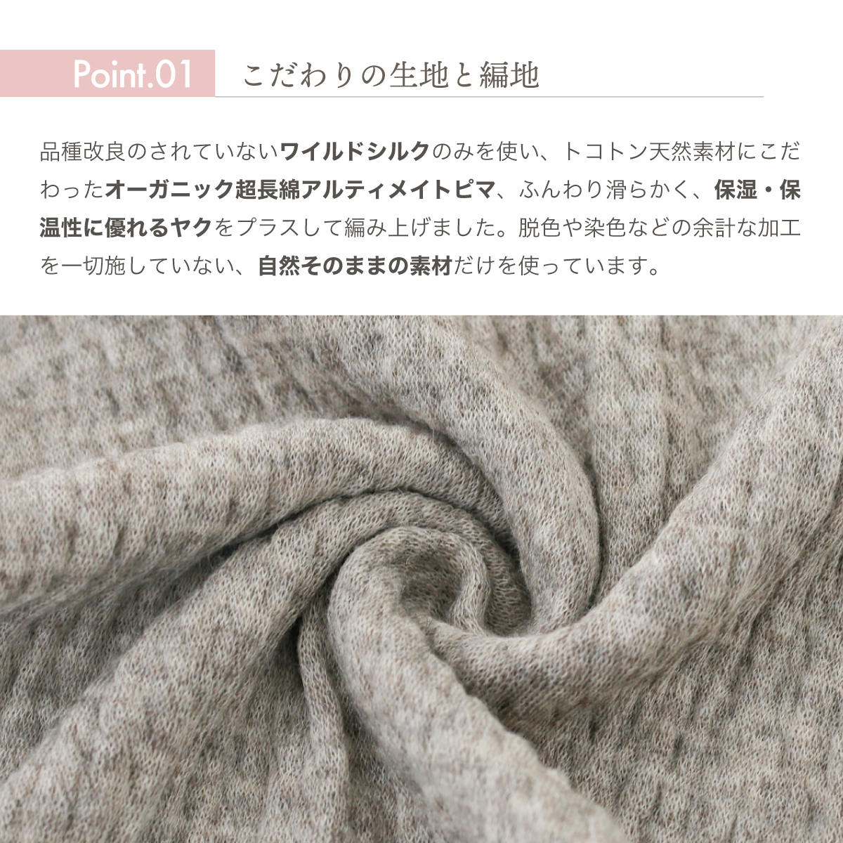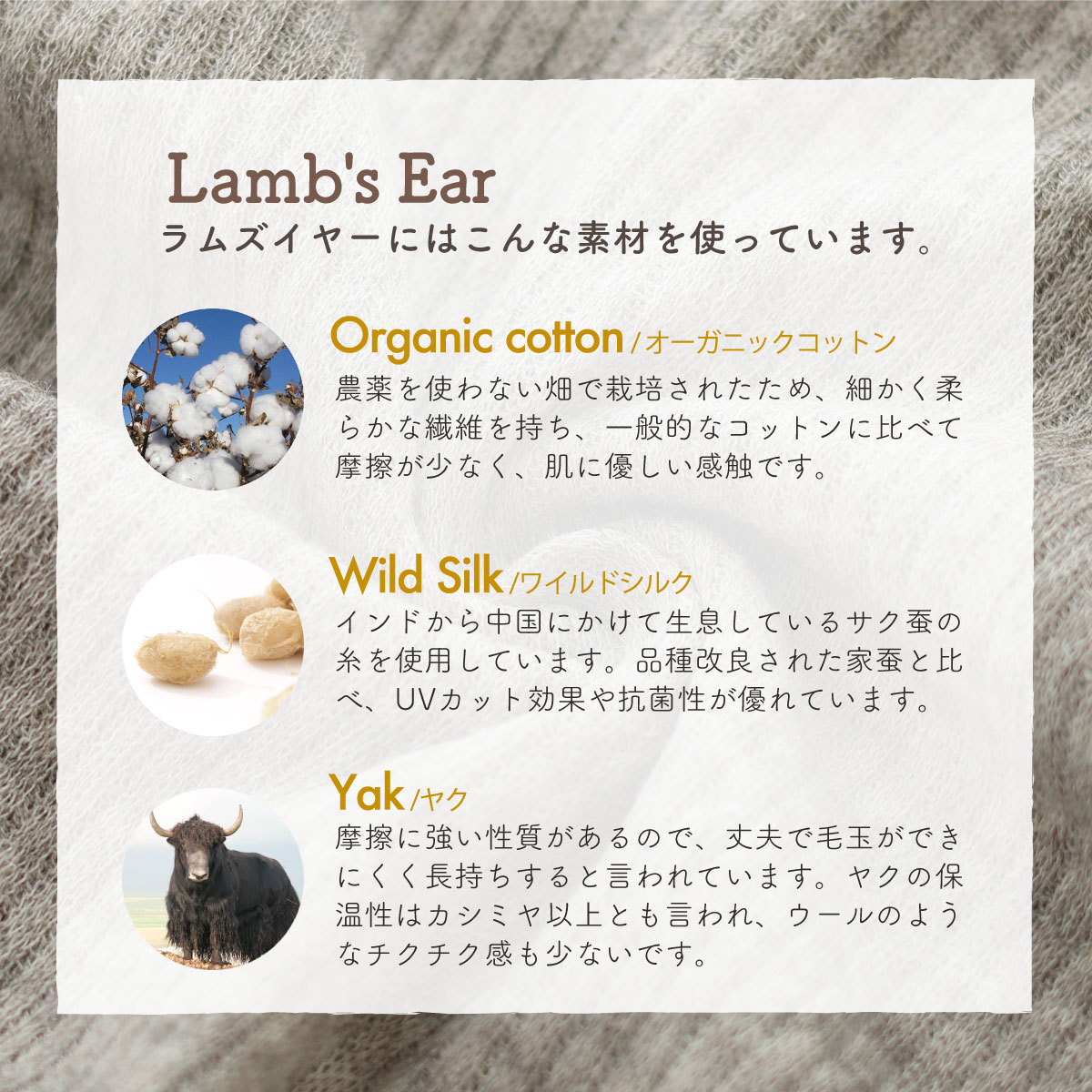 ※オーガニックコットン、ワイルドシルク、ヤクの混紡糸を使用しています。