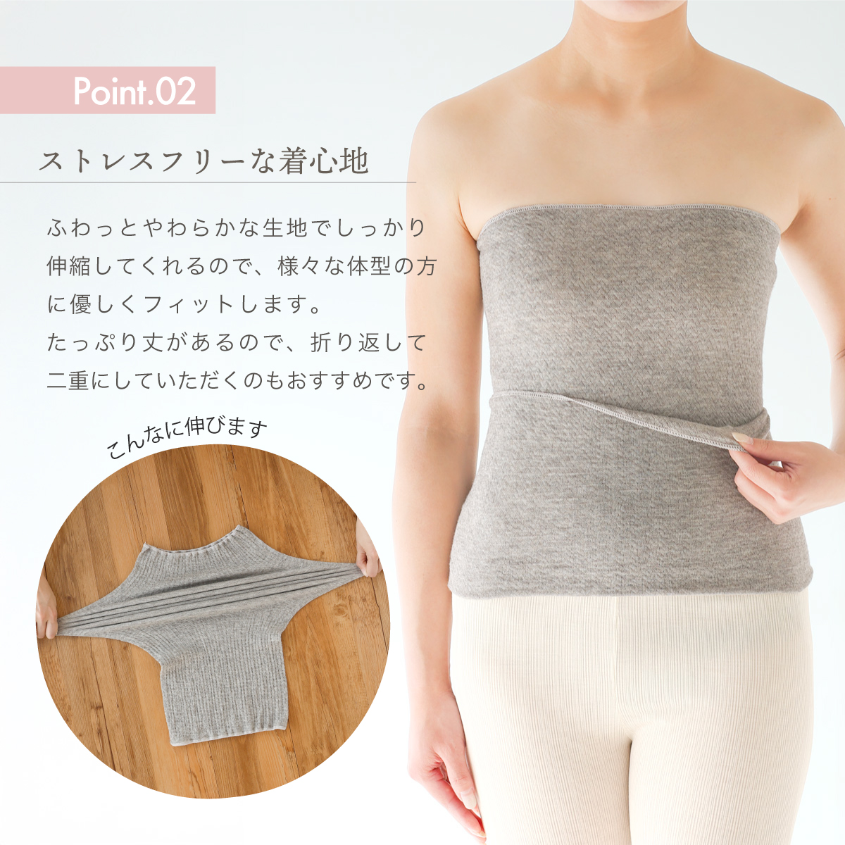 生地がゆったりと伸縮し、優しい着用感と肌触りを感じていただけます。