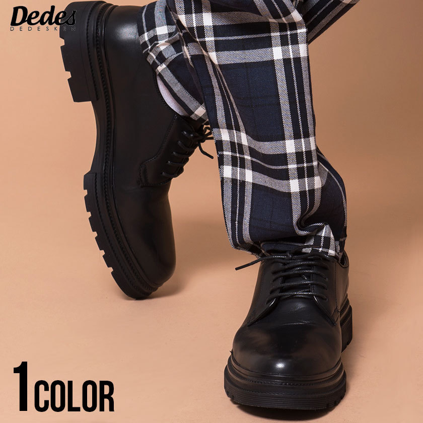 ドレス寄りのアッパーに厚みのある武骨なタンクソールを融合させ、モードやきれいめ、カジュアルや韓国系などと幅広いファッションに合わせやすい一足です。