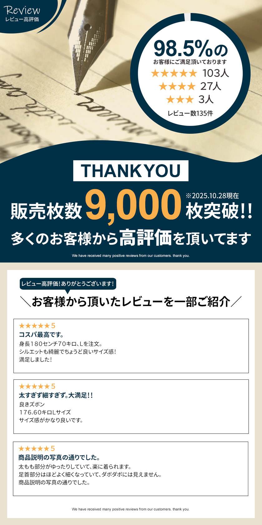 XL:着丈100股上30股下69ウエスト41(最大+4cm程度)ヒップ56わたり(もも幅)35膝幅23裾幅18