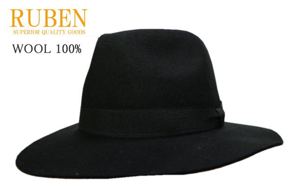 送料無料 RUBEN つば広ハット フラット 中折れハット ツバストレート 男女兼用 秋冬 ウール100% ブラック
