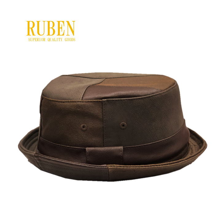 送料無料 RUBEN レザー風 ポークパイ ハット パッチワーク ロールアップ ブラウン 帽子 サイズ調整可能 フリーサイズ
