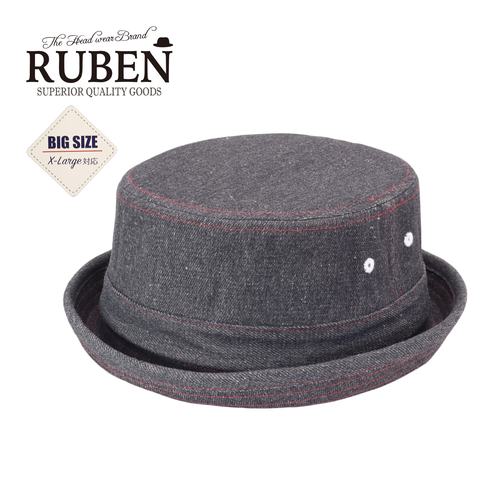 送料無料 大きいサイズ RUBEN デニム ポークパイ ハット ブラック ロールアップ 男女兼用 帽子 サイズ調整可能 Bigsize