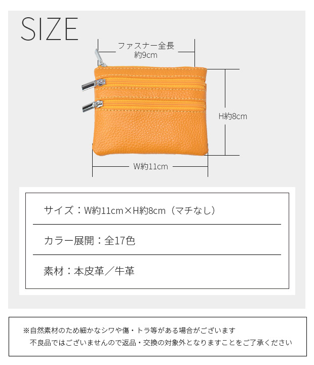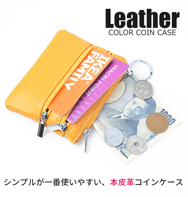 爆買 しなやかで柔らかい本格レザーをカラフルに染め上げた、本皮革コインケース20色登場!お札も入るメインポケットはキーリング付きで便利。フロントにはファスナー付きポケット×2、背面には交通ICカードなどに便利なさっと取り出せるポケット付き。お気に入りがきっと見つかる全20色展開。本革 コインケース 小銭入れ 小型財布 ファスナー キーケース 牛革 本皮革 レザー 革 カラーレザー リアルレザー キーリング 鍵 ケース パスケース 定期入れ 財布 さいふ 多機能 メンズ レディース ミニ 革小物 チャック スリム 財布 コインケース 小銭入れ パスケース 定期入れ カードケース シンプル コンパクト イエロー オレンジ ピンク レッド グリーン ブルー ネイビー パープル キャメル ブラウン ブラック●サイズ:約W11cmxH8cm詳細は画像にてご確認下さいませ●カラー:全17色マスタードオレンジピンクベージュローズピンクレッドボルドーグリーンオリーブダークグリーンライトブルーブルーネイビーパープルキャメルブラウンダークブラウンブラックイエローダークパープルベージュ●素材:本革/牛革