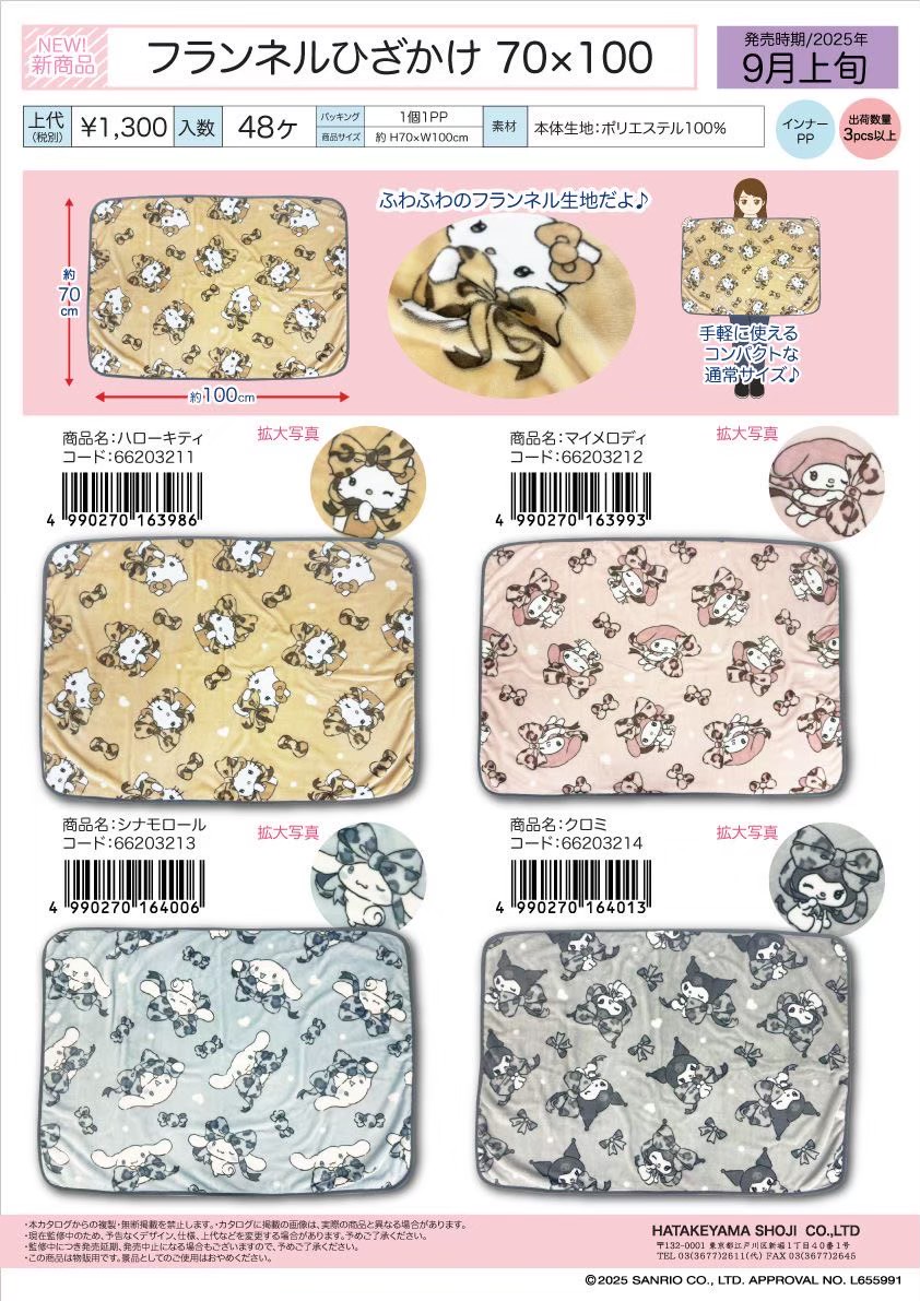 サンリオの人気キャラクターのフランネル生地のひざかけの登場!フランネル生地なので触り心地抜群です!また保温性もありしっかり温めてくれます!デザインも可愛いので姉妹でお揃いや友達へのプレゼントなどにもおすすめです♪