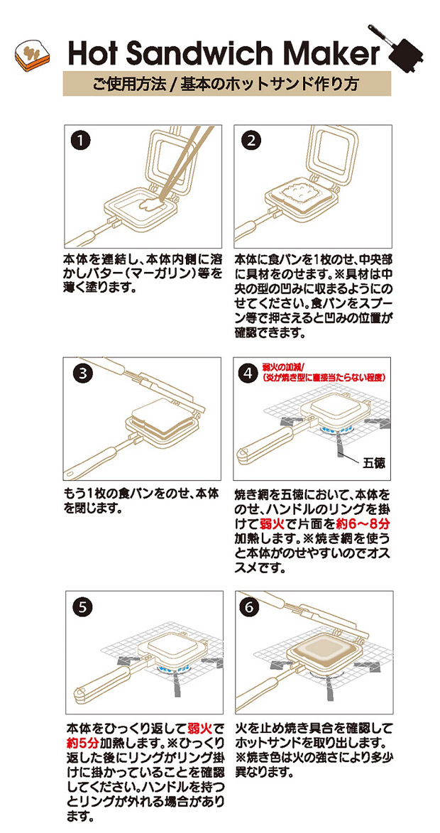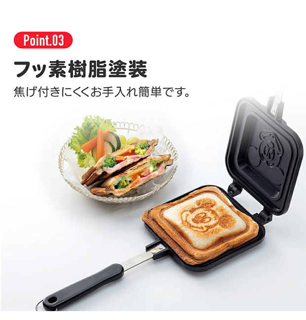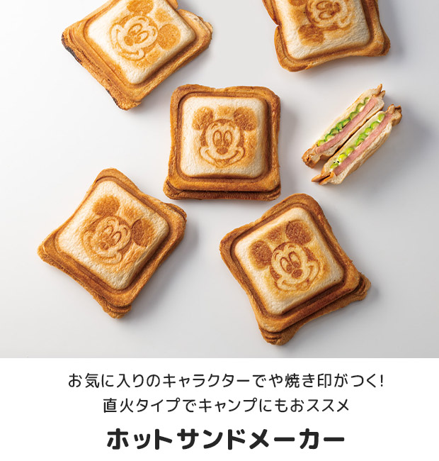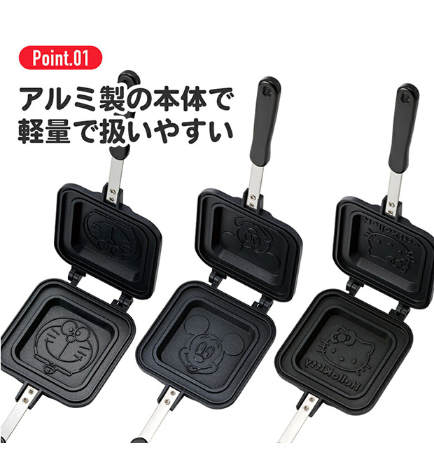 爆買 お気に入りのキャラクターが焼き印でつくホットサンドメーカー。アルミ製の本体で、軽量で扱いやすいのがポイント。ヒンジ部分で、分解することが可能。両面に焼き印加工がされているので、分解して使ってもキャラクターの焼き印がつきます。直火仕様なので、ご家庭でもアウトドアでもご使用いただけます。