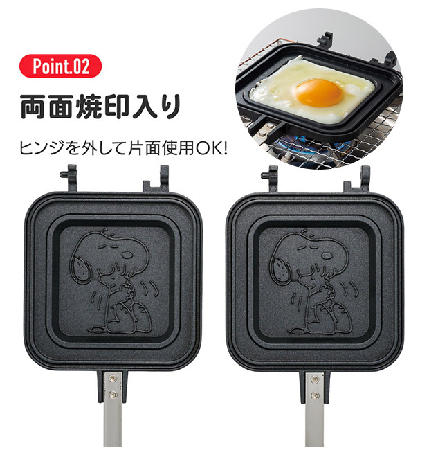 お気に入りのキャラクターが焼き印でつくホットサンドメーカー。アルミ製の本体で、軽量で扱いやすいのがポイント。ヒンジ部分で、分解することが可能。両面に焼き印加工がされているので、分解して使ってもキャラクターの焼き印がつきます。直火仕様なので、ご家庭でもアウトドアでもご使用いただけます。