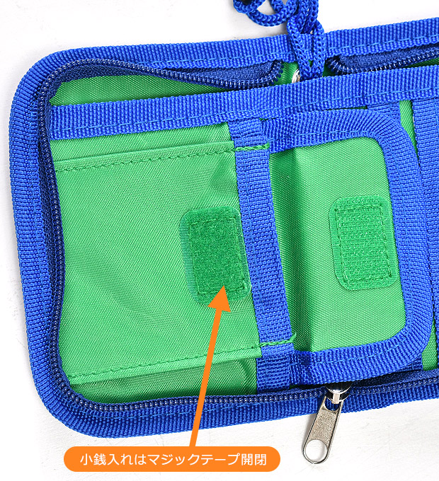 二つ折りタイプで、カード入れや小銭入れが付いており、収納力も抜群です。ファスナーやマジックテープでしっかりと中身を守ります。