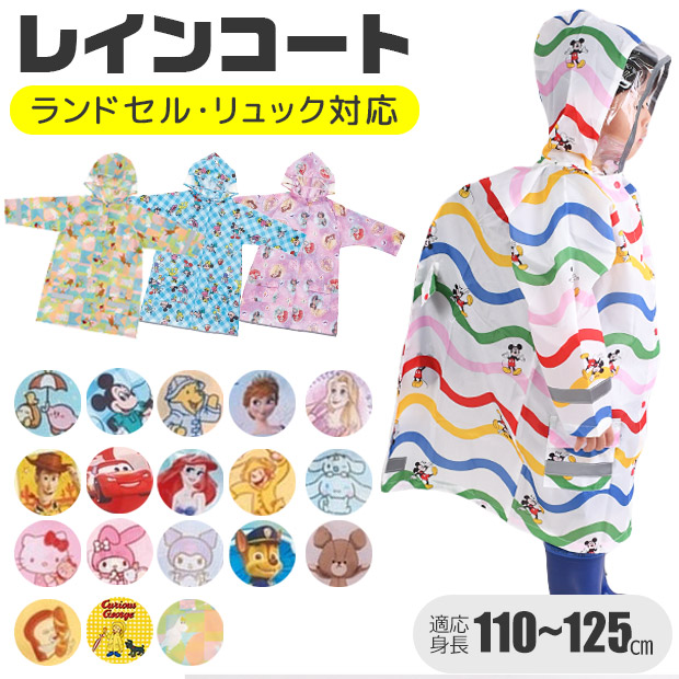 爆買 かわいい子供用レインコートで雨の日のお出かけも楽しく♪後ろのボタンを外すとランドセルやリュックを背負ったまま使えます。暗い道でも安心の反射テープが前後左右7か所についています。フードの顔周りは首元まで透明になっているので周りが見えやすく、左右の視界も邪魔しにくい。フタ付きのポケット、ネームタグ付き。適応サイズ:身長110〜125cm対応のワンサイズです。