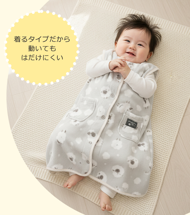 かける毛布よりも“着るタイプ”の方がはだけにくく安心だから、元気に動くお子さまや赤ちゃんの夜の冷え対策にもぴったり。