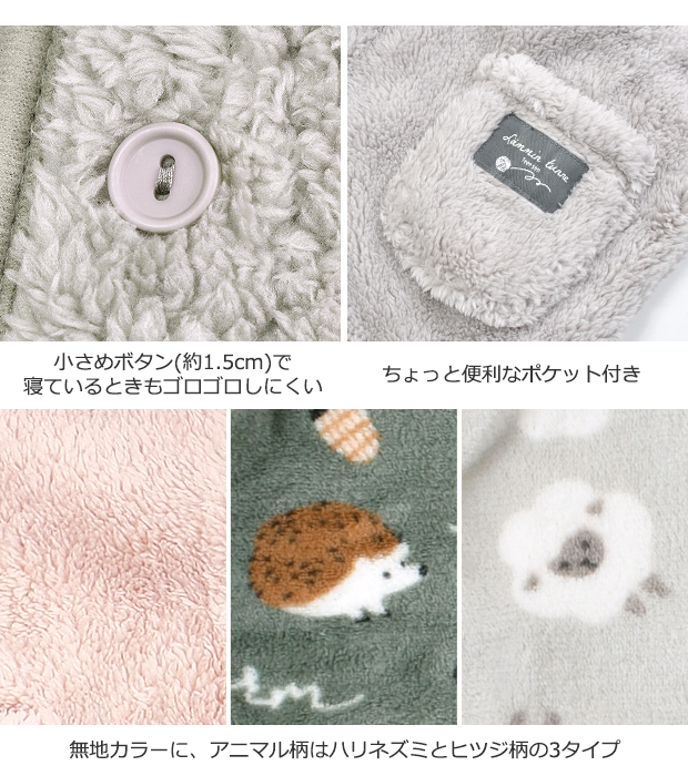 人気の「はりねずみ」と「ひつじ」モチーフがかわいい、男女兼用のキッズ・ベビー用スリーパーです。