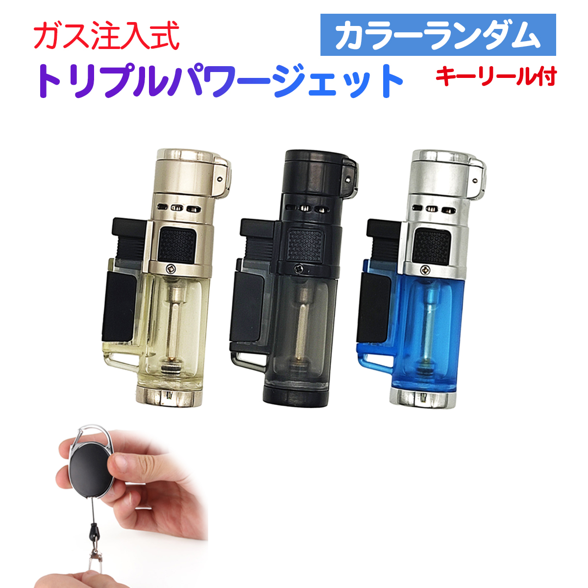 ライター 強火力 トリプルパワージェット式 ターボ式 着火ライター ガス詰替可タイプ ストラップホール付 色ランダム キーリールセット 送料無料