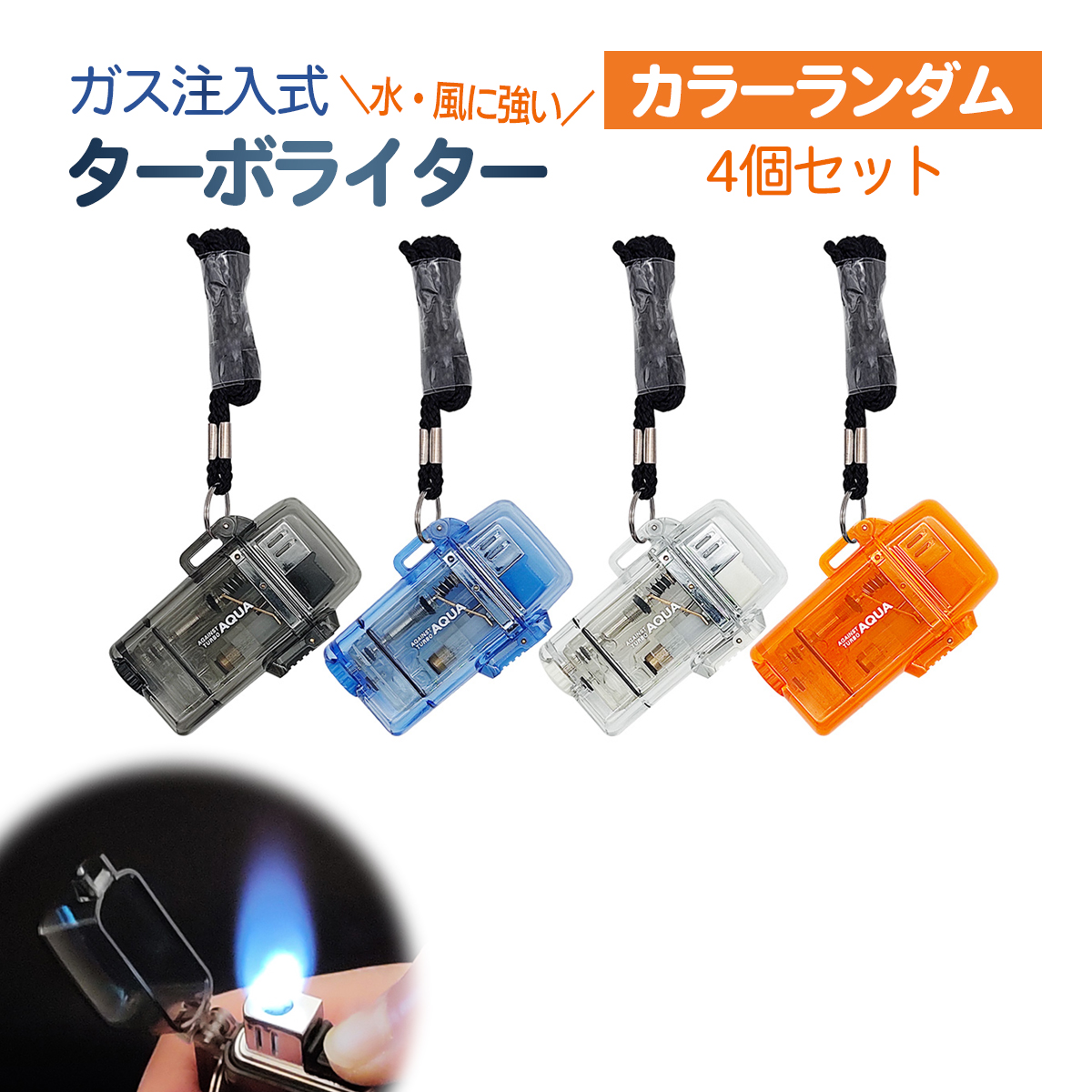 ライター 防水 ターボ式 着火ライター ガス詰替可タイプ ガス注入式 首掛け紐付き 海水浴・釣り・ボートなどに ランダムカラー 4個セット 送料無料
