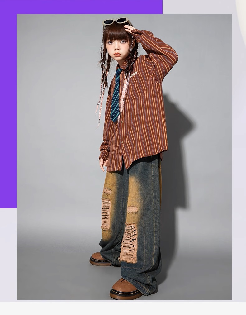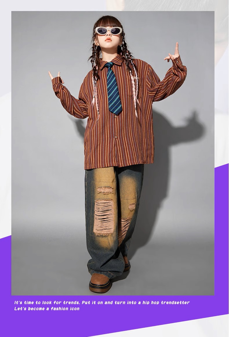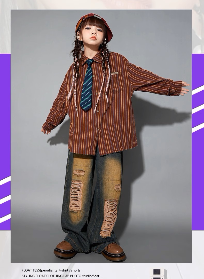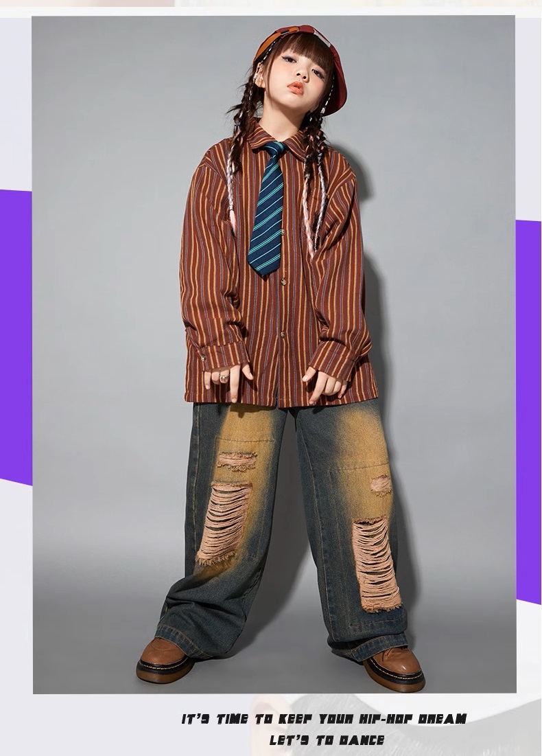 シャツ キッズダンス衣装 ヒップホップ ファッション ダンス衣装 キッズ トップス 柄シャツ 派手 K-POP 韓国 ストライプ 茶色 ダメージデニム