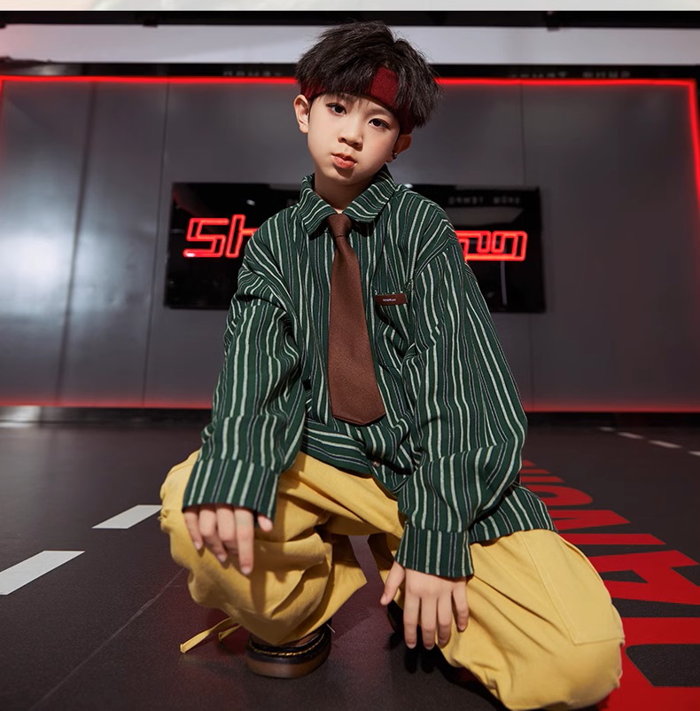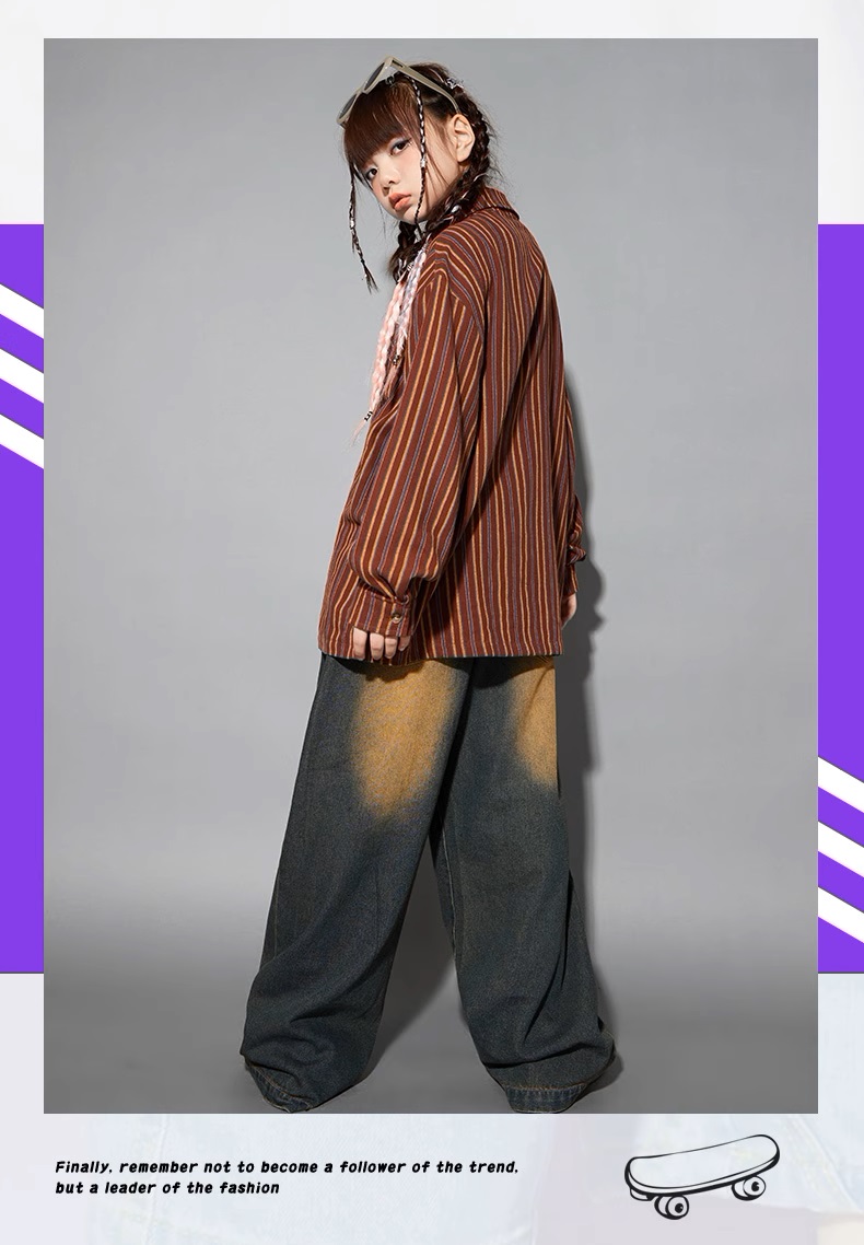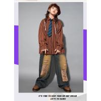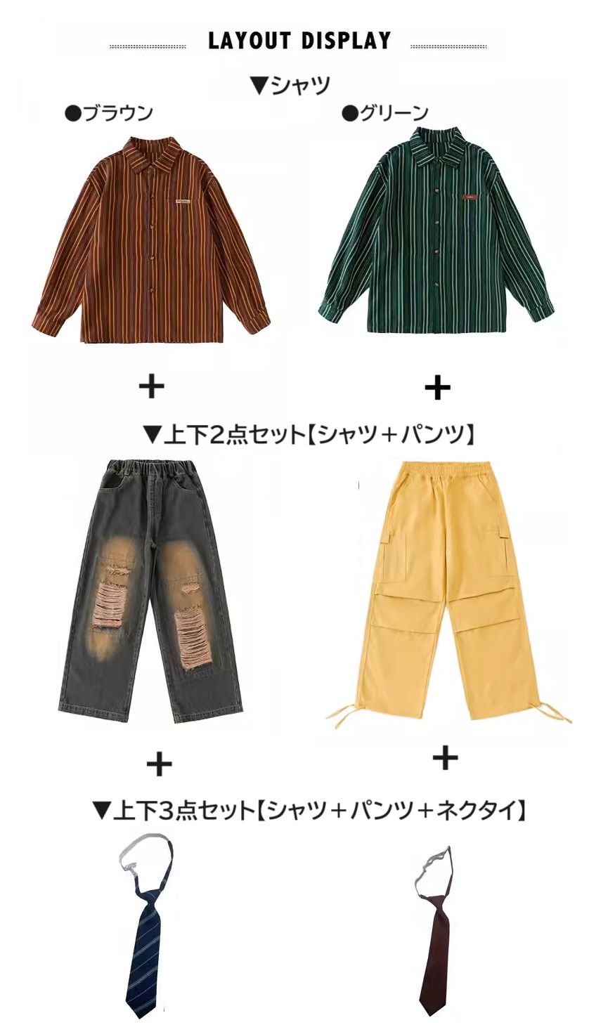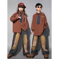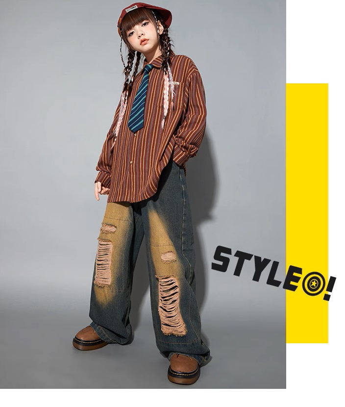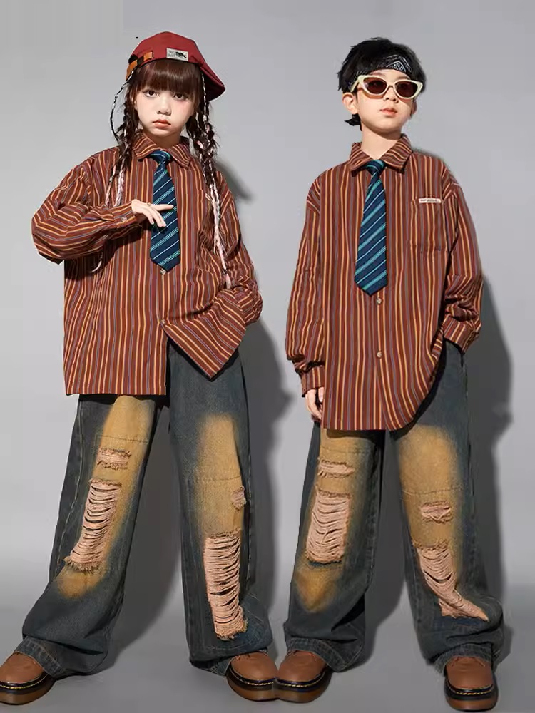 シャツ キッズダンス衣装 ヒップホップ ファッション ダンス衣装 キッズ トップス 柄シャツ 派手 K-POP 韓国 ストライプ 茶色 ダメージデニム