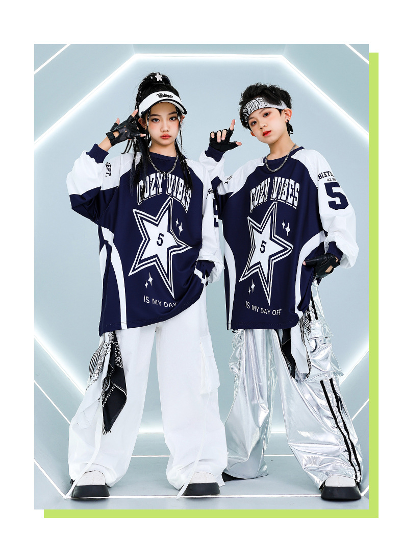 ヒップホップ 衣装 セットアップ 派手 ネイビー 白 銀 メタル ダンス衣装 キッズ 子供ダンス服 ダンスウェア K-POP 韓国 男の子 ガールズ ロンT パンツ