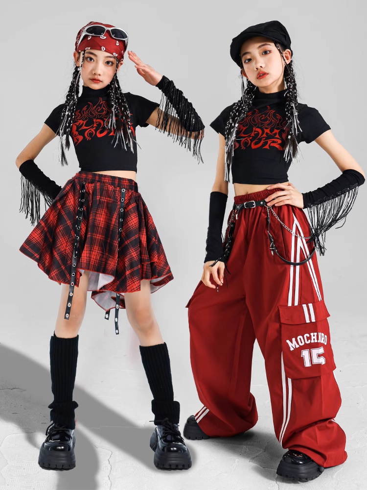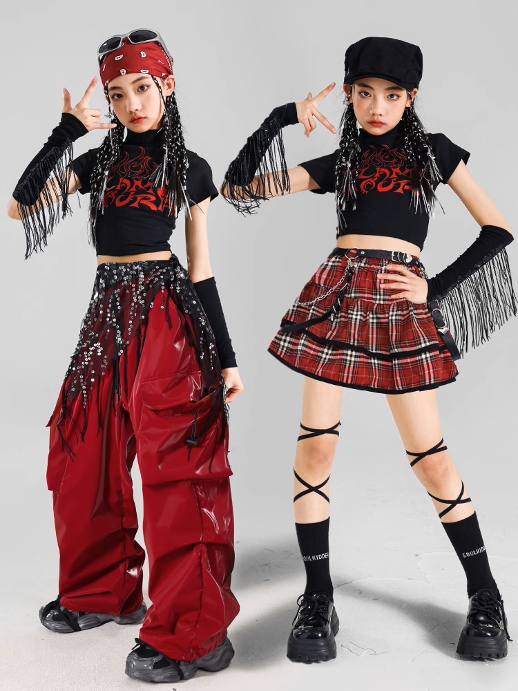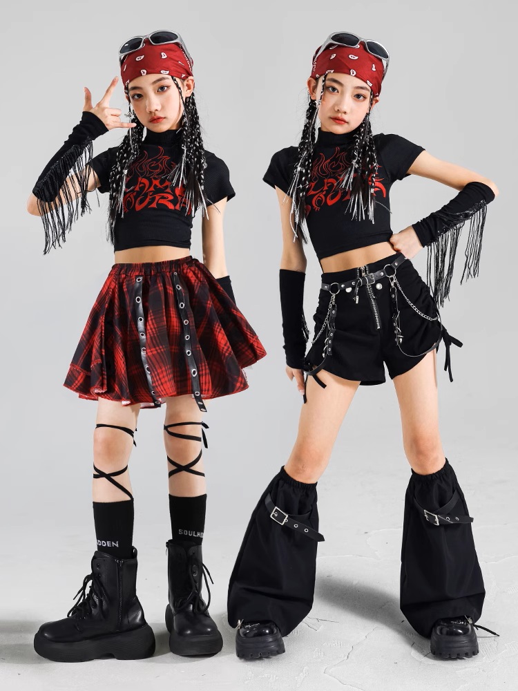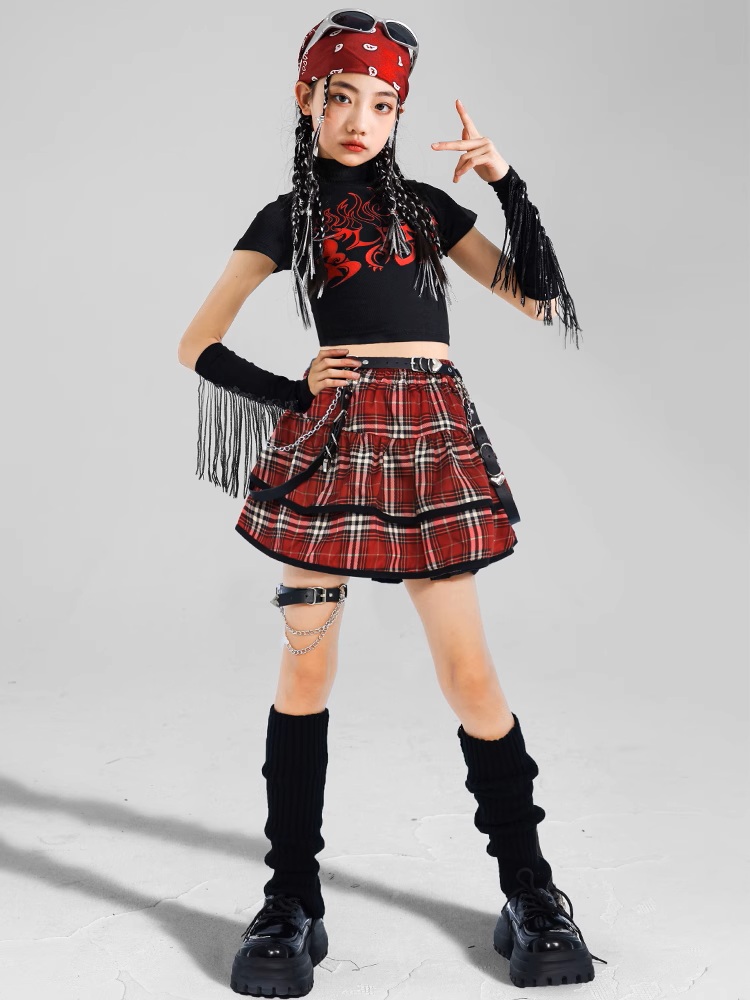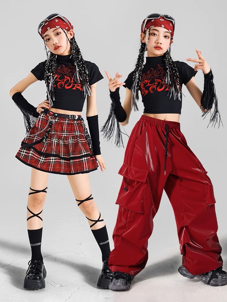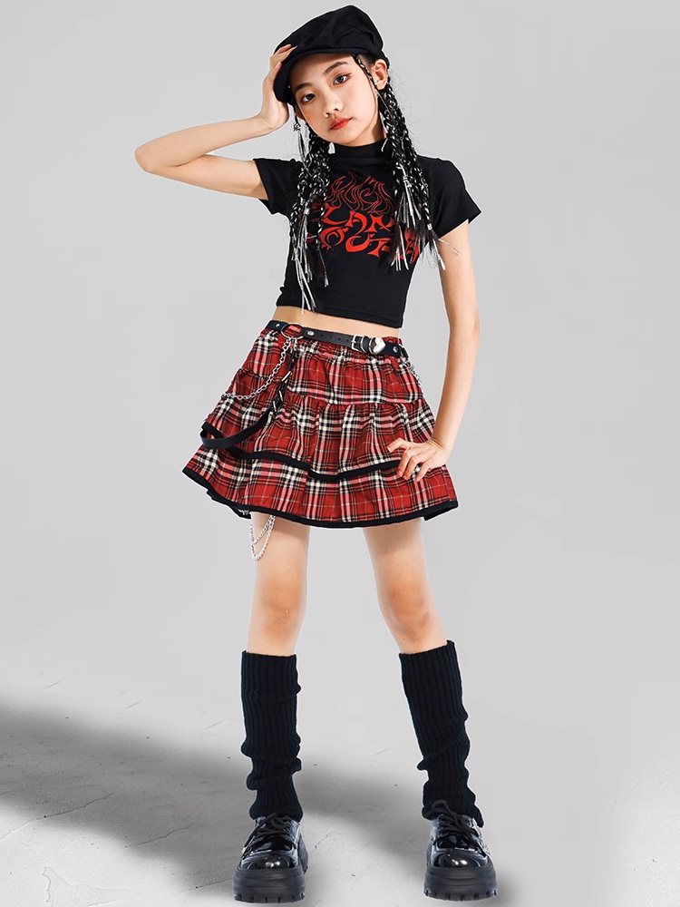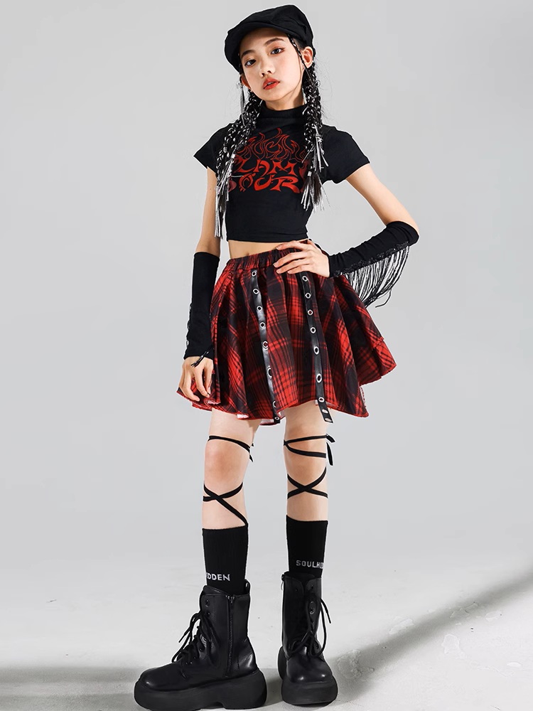 ダンス衣装 キッズ セットアップ チアダンス ガールズ ヒップホップ 衣装 ヘソ出しトップス チェック柄 スカート レザーパンツ 派手 K-POP 韓国 黒 赤