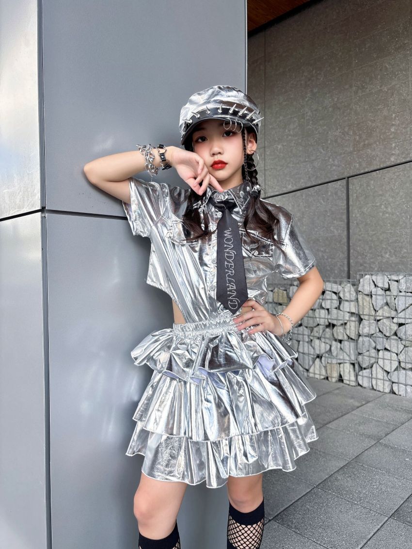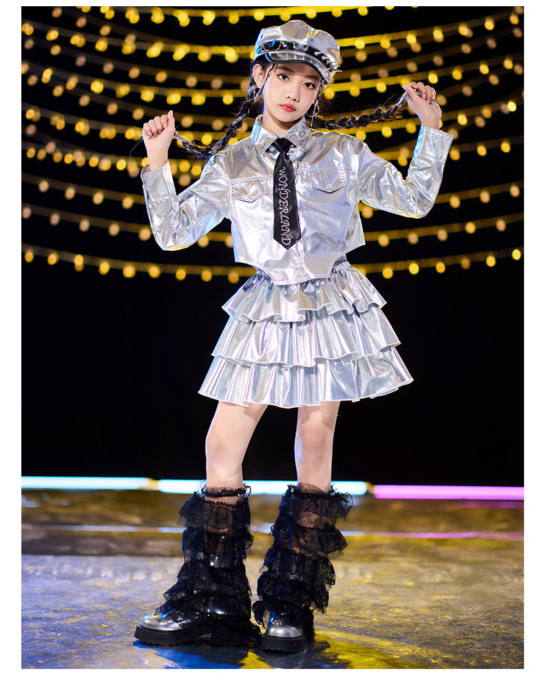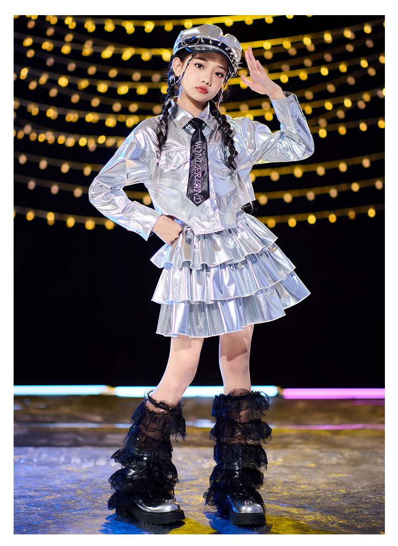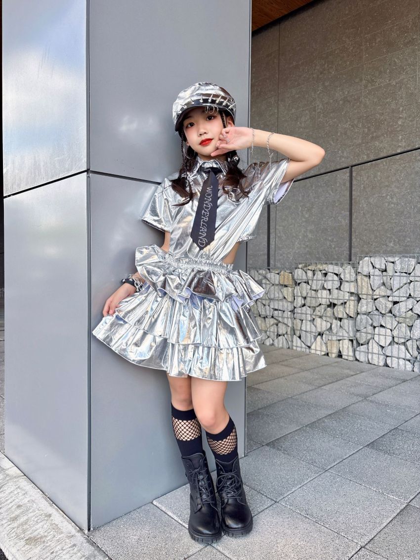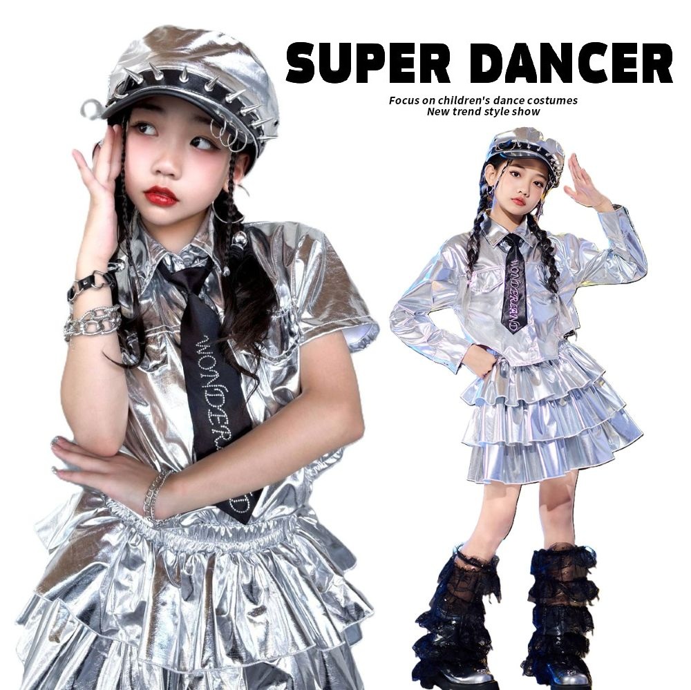キッズダンス衣装 セットアップ 制服風 メタリック ガールズ ヒップホップ 衣装 かっこいい ダンス衣装 K-POP 韓国 銀 シルバー 光沢 キラキラ衣装