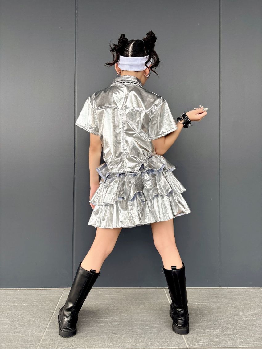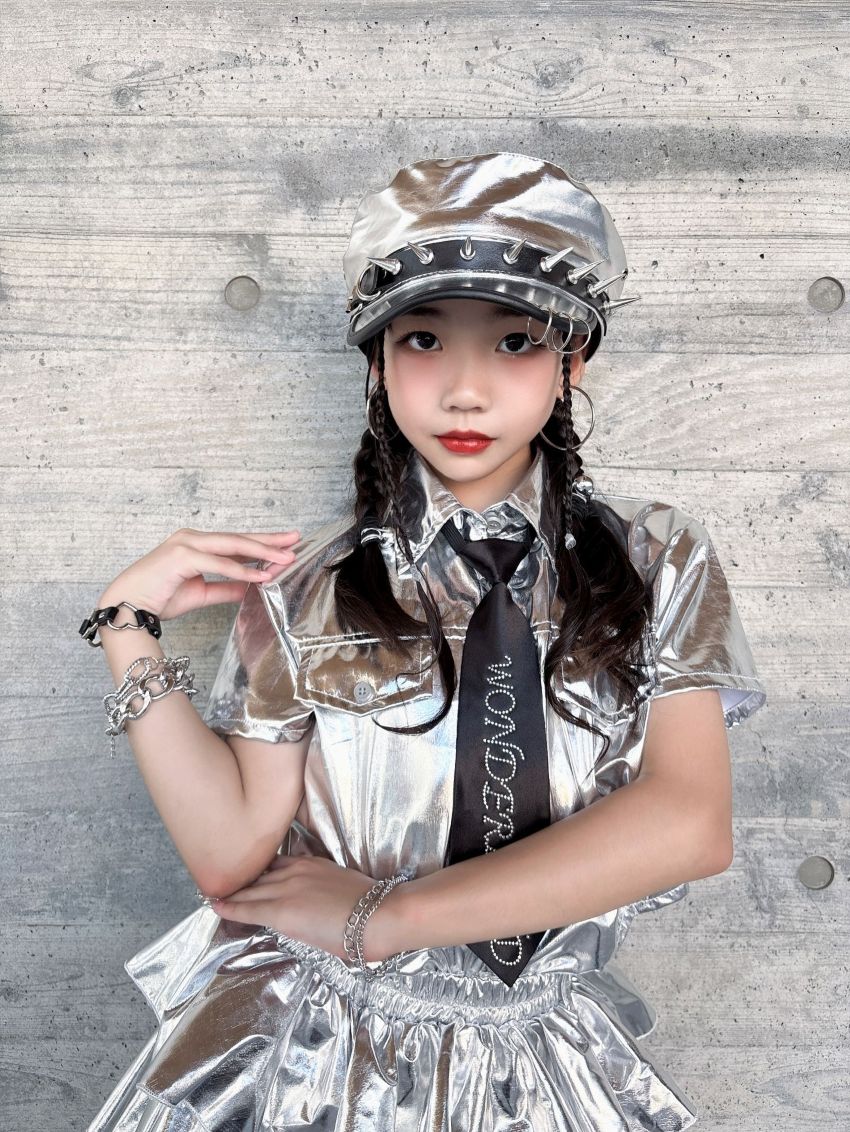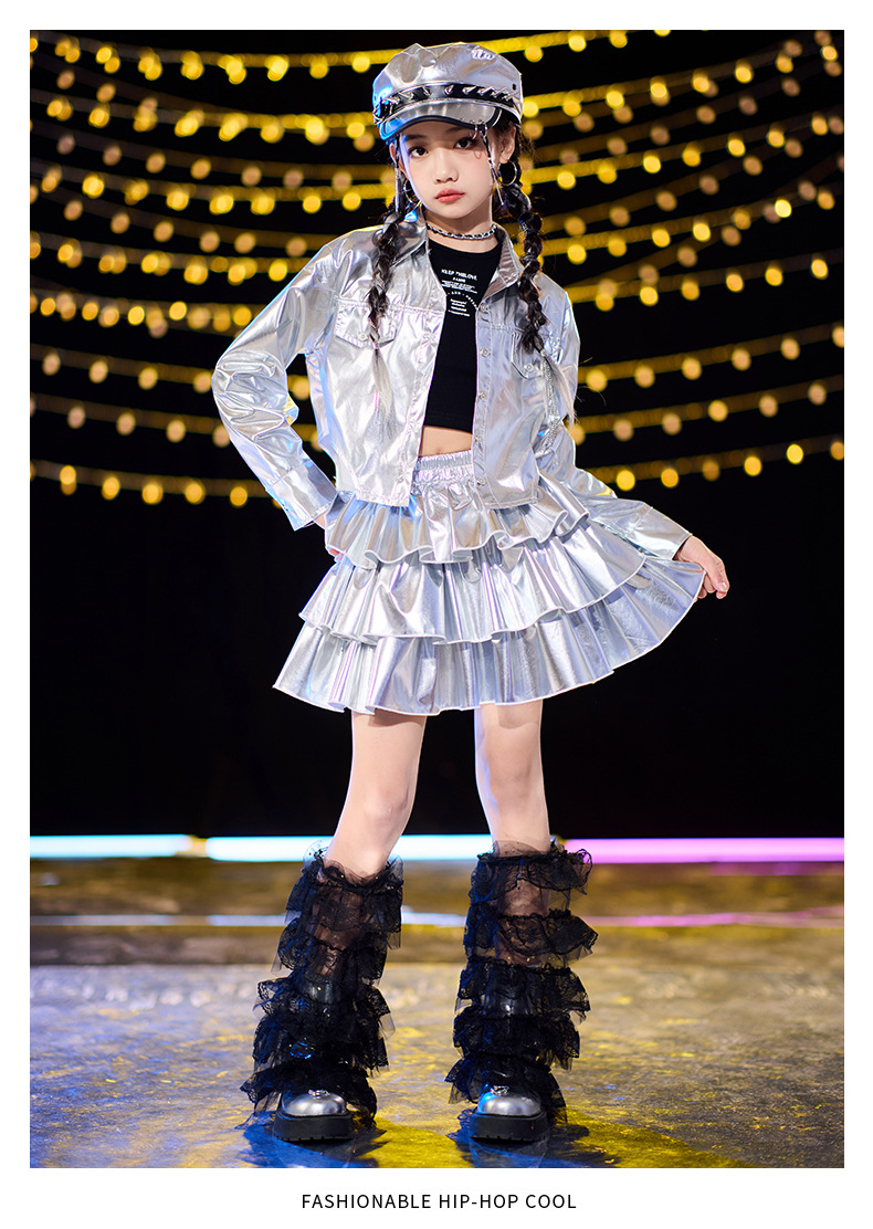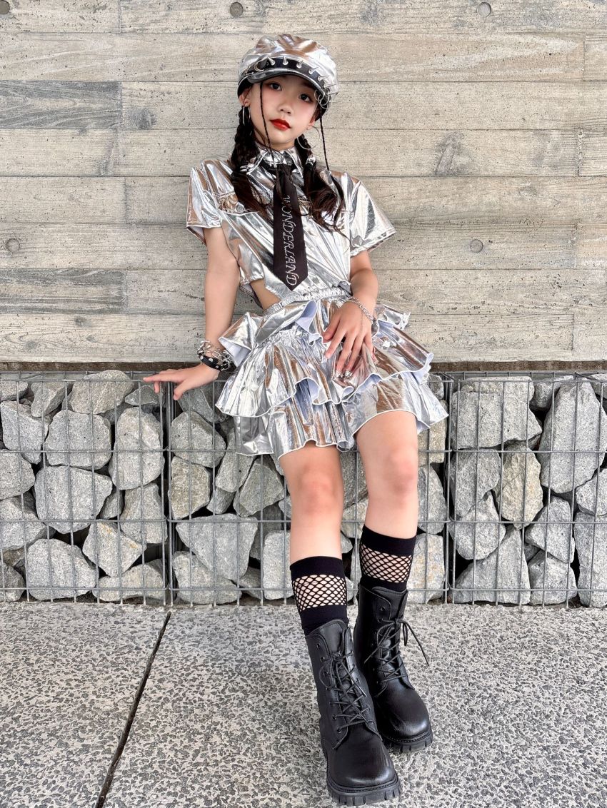 キッズダンス衣装 セットアップ 制服風 メタリック ガールズ ヒップホップ 衣装 かっこいい ダンス衣装 K-POP 韓国 銀 シルバー 光沢 キラキラ衣装