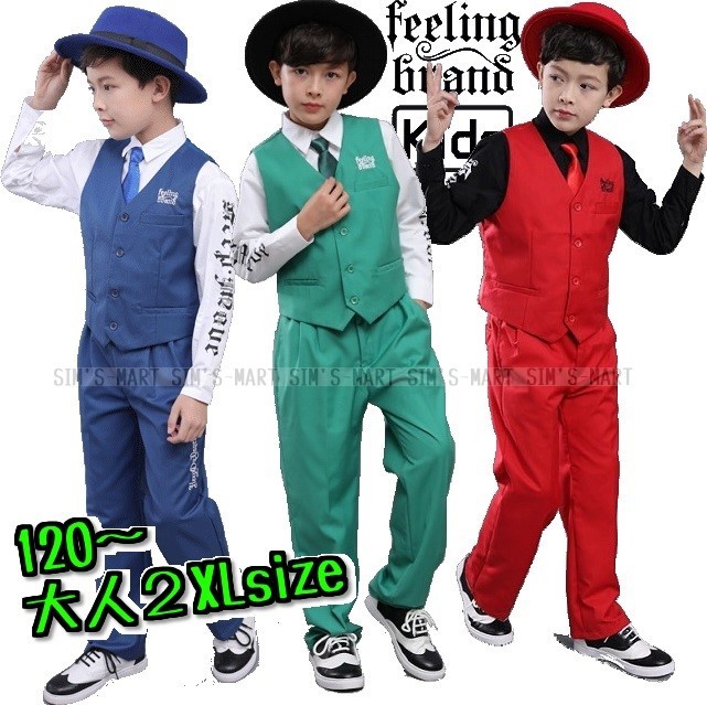 ロックダンス衣装 キッズダンス 子供 大人 スーツ ベスト スラックス 赤 青 緑 グレー