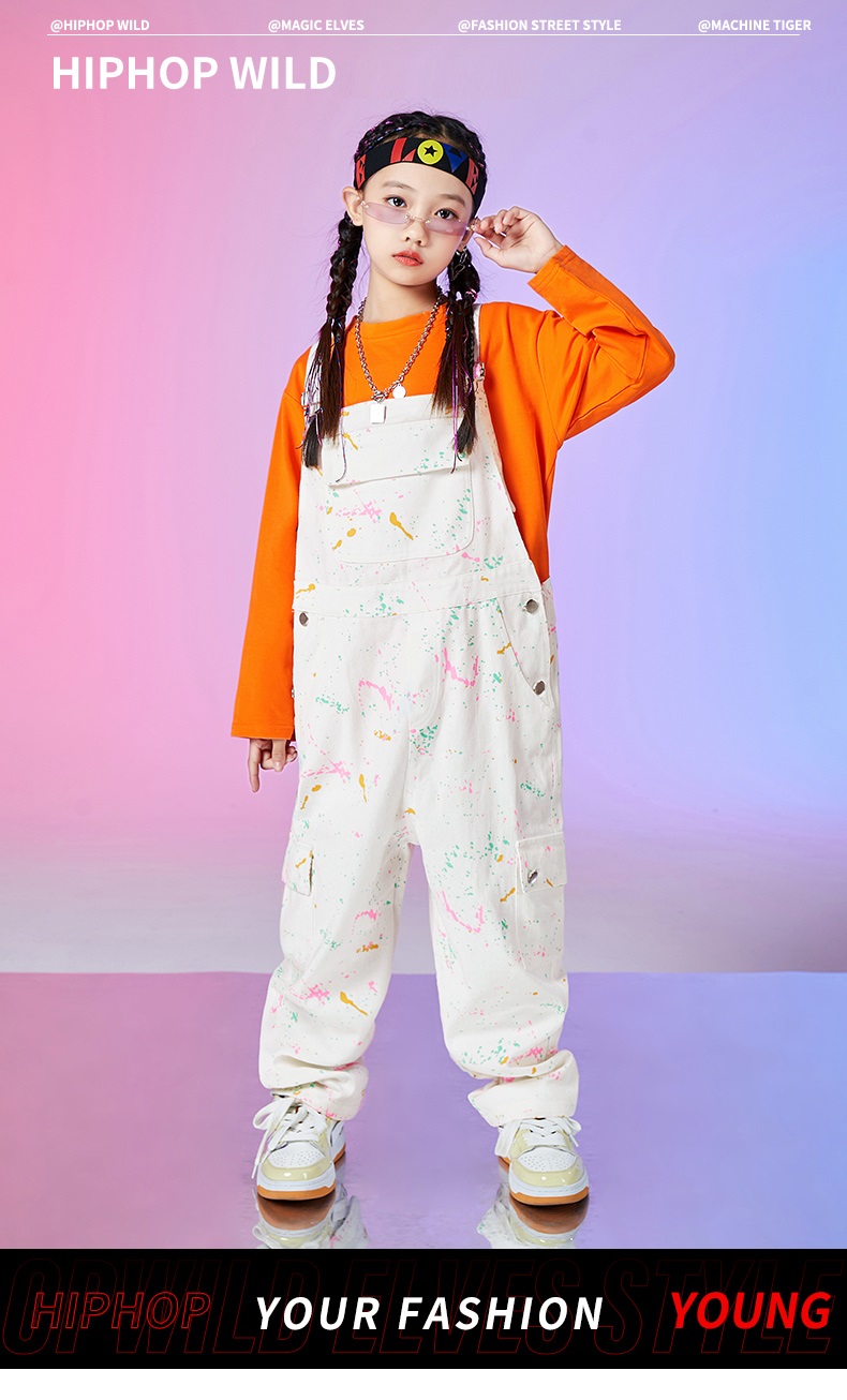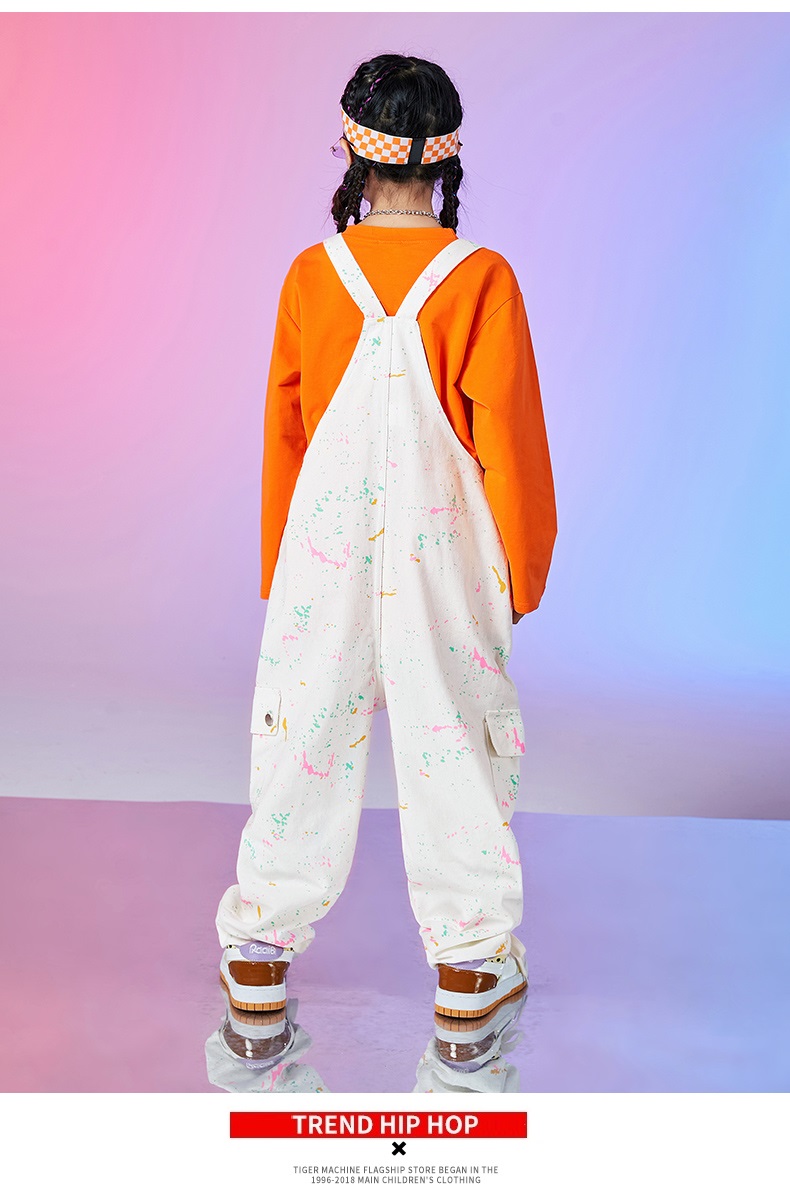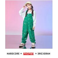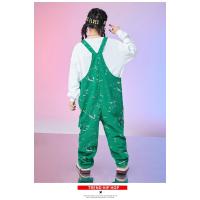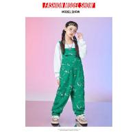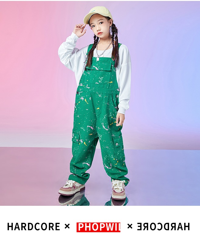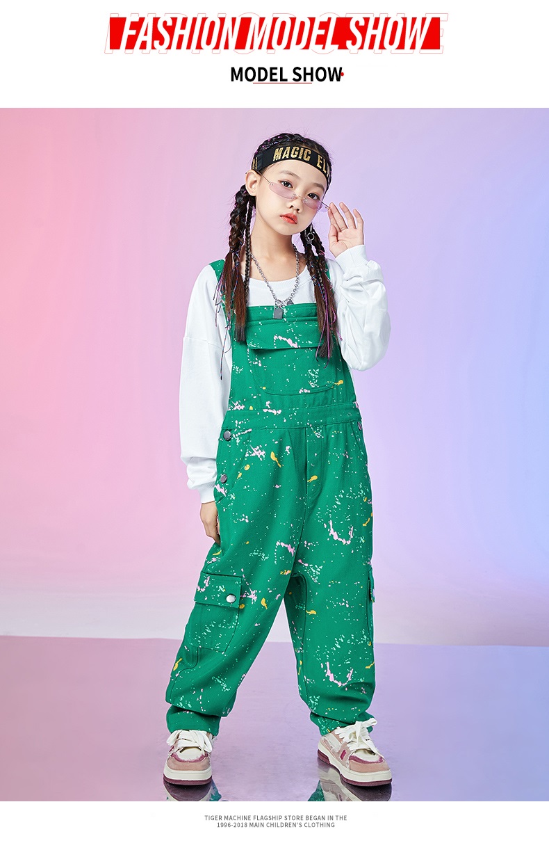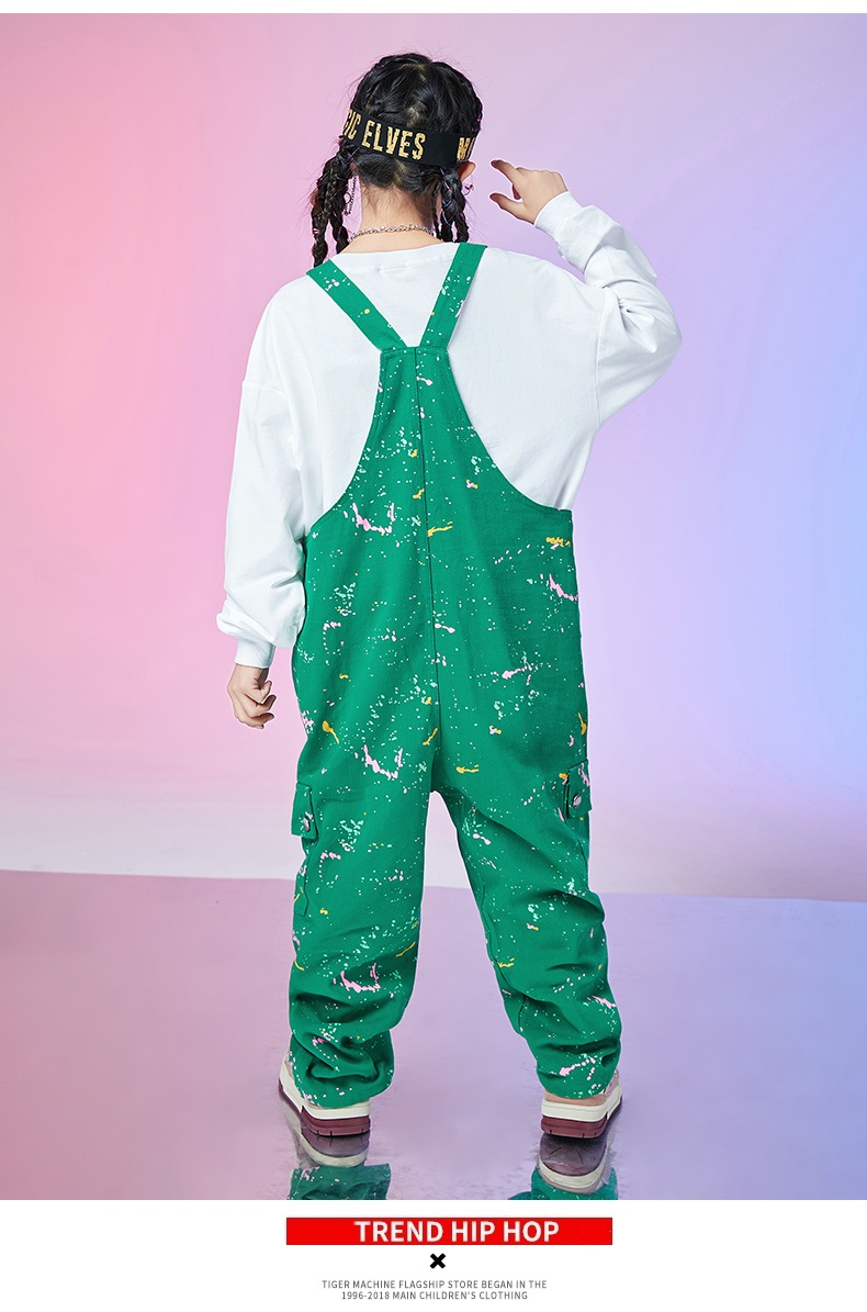 オーバーオール キッズダンス衣装 ヒップホップ ファッション ダンス衣装 キッズ 派手 つなぎ K-POP 韓国 サロペット 緑 白 ペイント柄