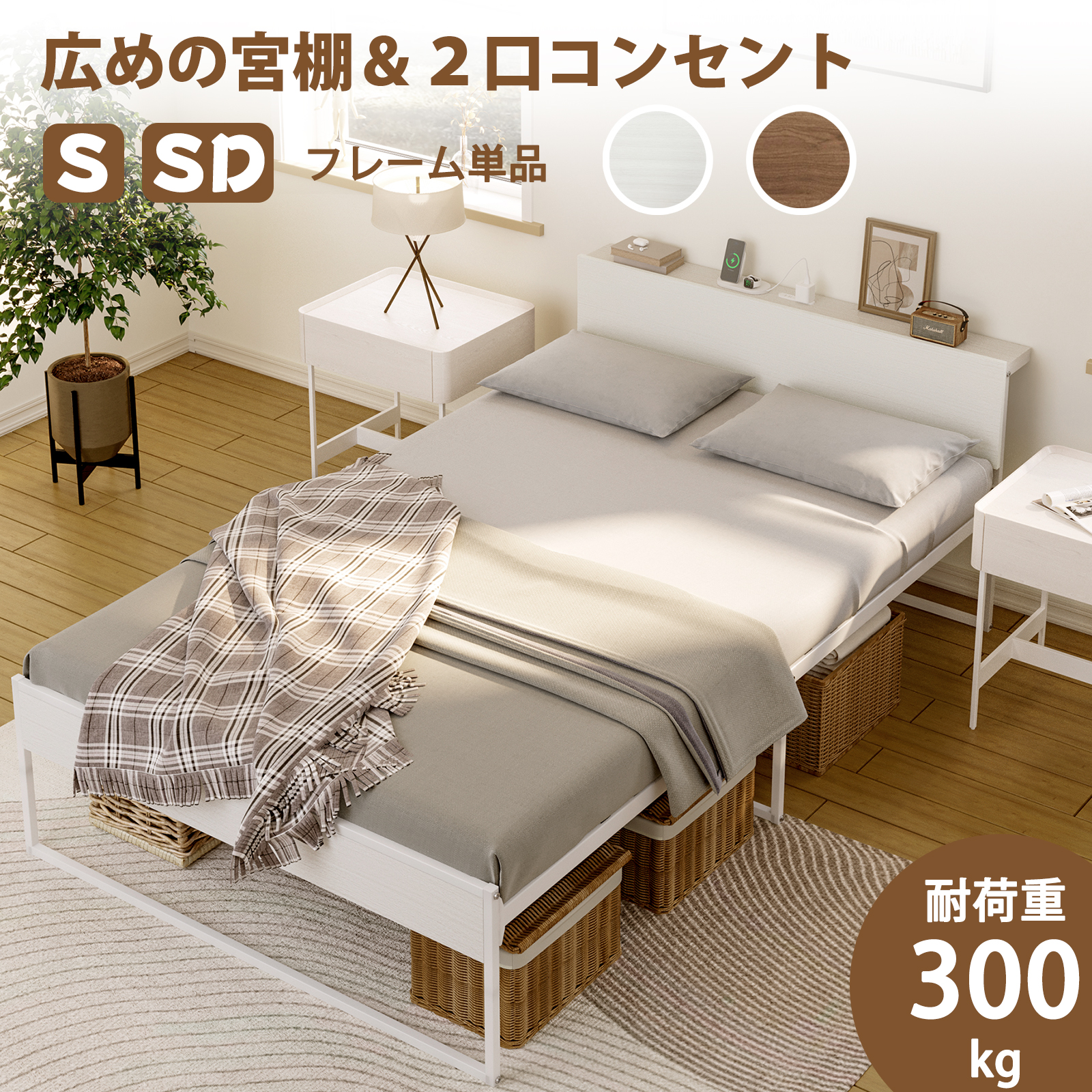 2口コンセント セミダブル ベッドフレーム 宮棚付き パイプベッド 高耐荷重 収納付き スチールベッド カビ防止 アイアンベッド ル脚付き フレームのみ 爆買