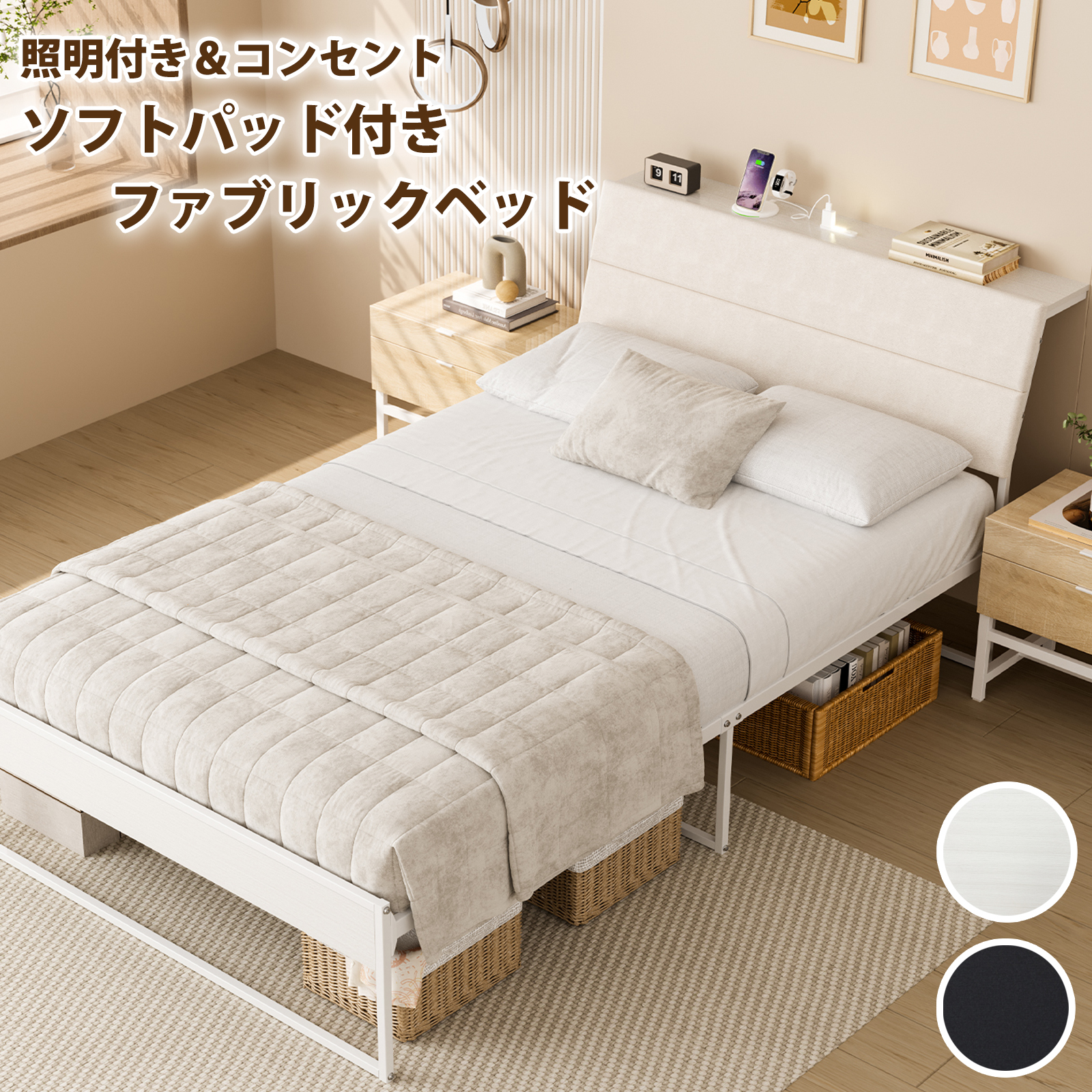 ファブリックベッド シングル ソフトパッド付き 傾斜があるヘッドボード 照明&コンセント ソファのような布張りベッドフレーム 広めの多機能宮棚 床下収納