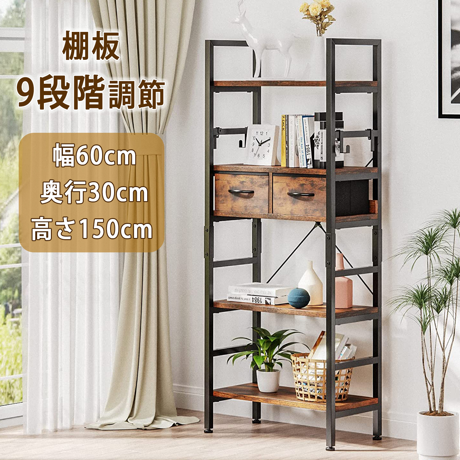 5段 オープンラック シェルフ 引き出し&フック付き ウッドシェルフ 多目的スチールラック ディスプレイラック 本棚 マガジンラック リビング キッチン収納