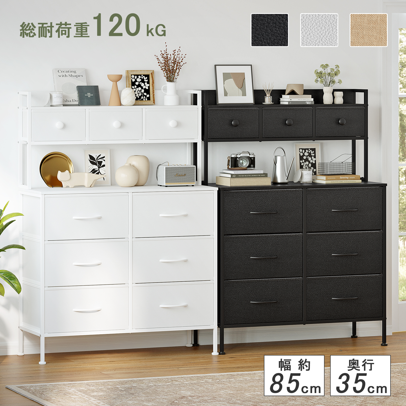 9杯ハイチェスト 2段棚タンス 収納チェスト・ドレッサー/化粧台・テーブル マルチチェスト 収納棚付き 布製引き出し 洋服・衣類収納・衣装ケース 箪笥 おしゃれ
