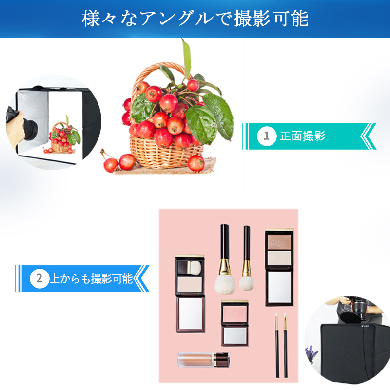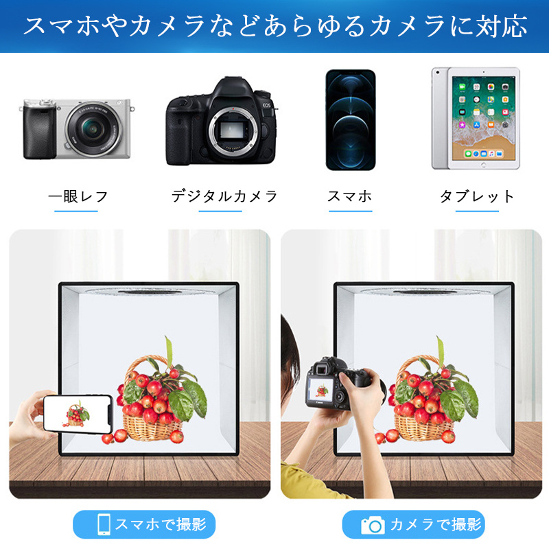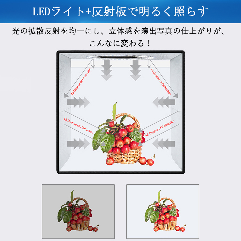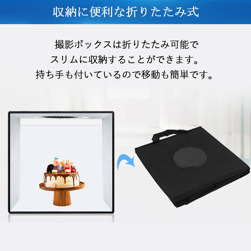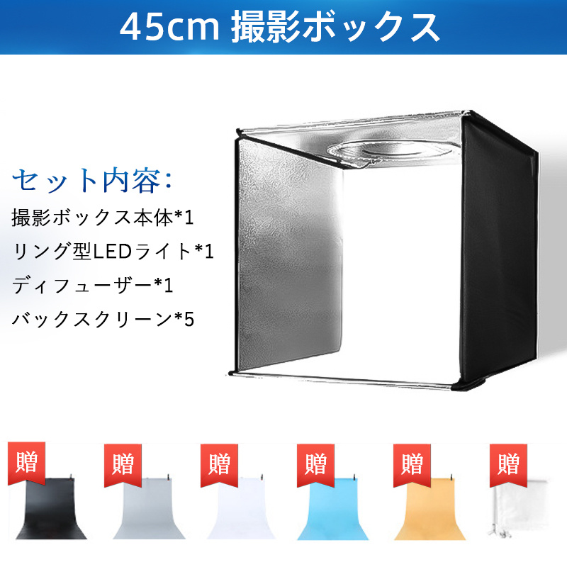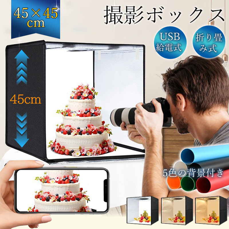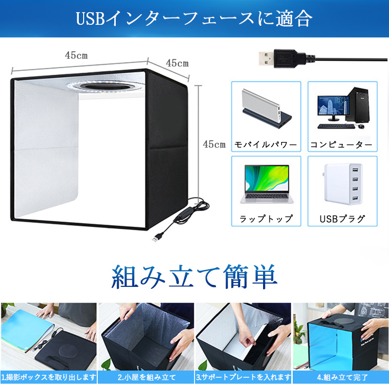 撮影ボックス 45cm 撮影キット ミニスタジオ LEDライト付 撮影ブース USB給電 折りたたみ 俯瞰撮影 初心者 撮影テント 物撮り 持ち運び