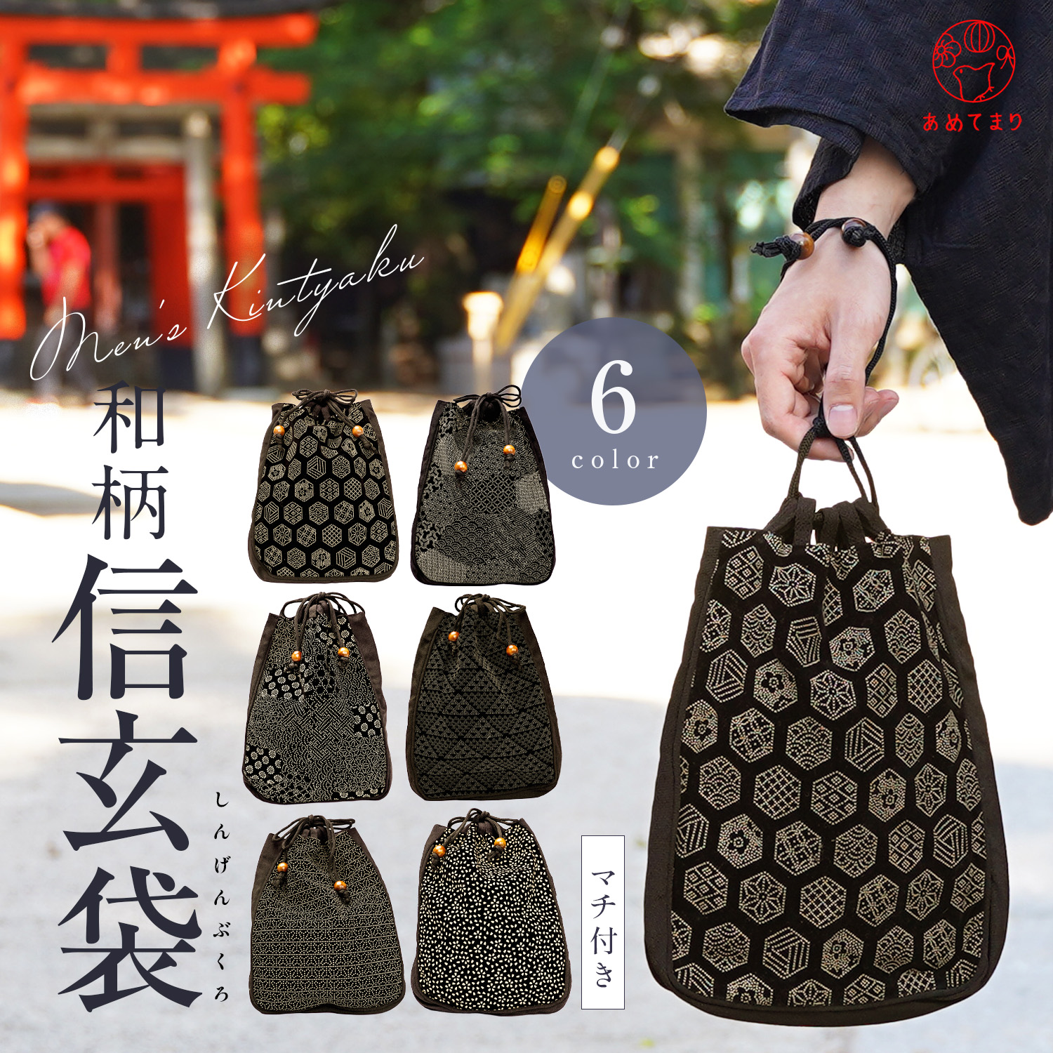 信玄袋 メンズ 巾着袋 印伝調 男性用 紳士 男 浴衣 巾着 バッグ マチあり 高見え 黒 高品質生地使用 木玉 粋 かっこいい 収納力抜群 シンプル おしゃれ