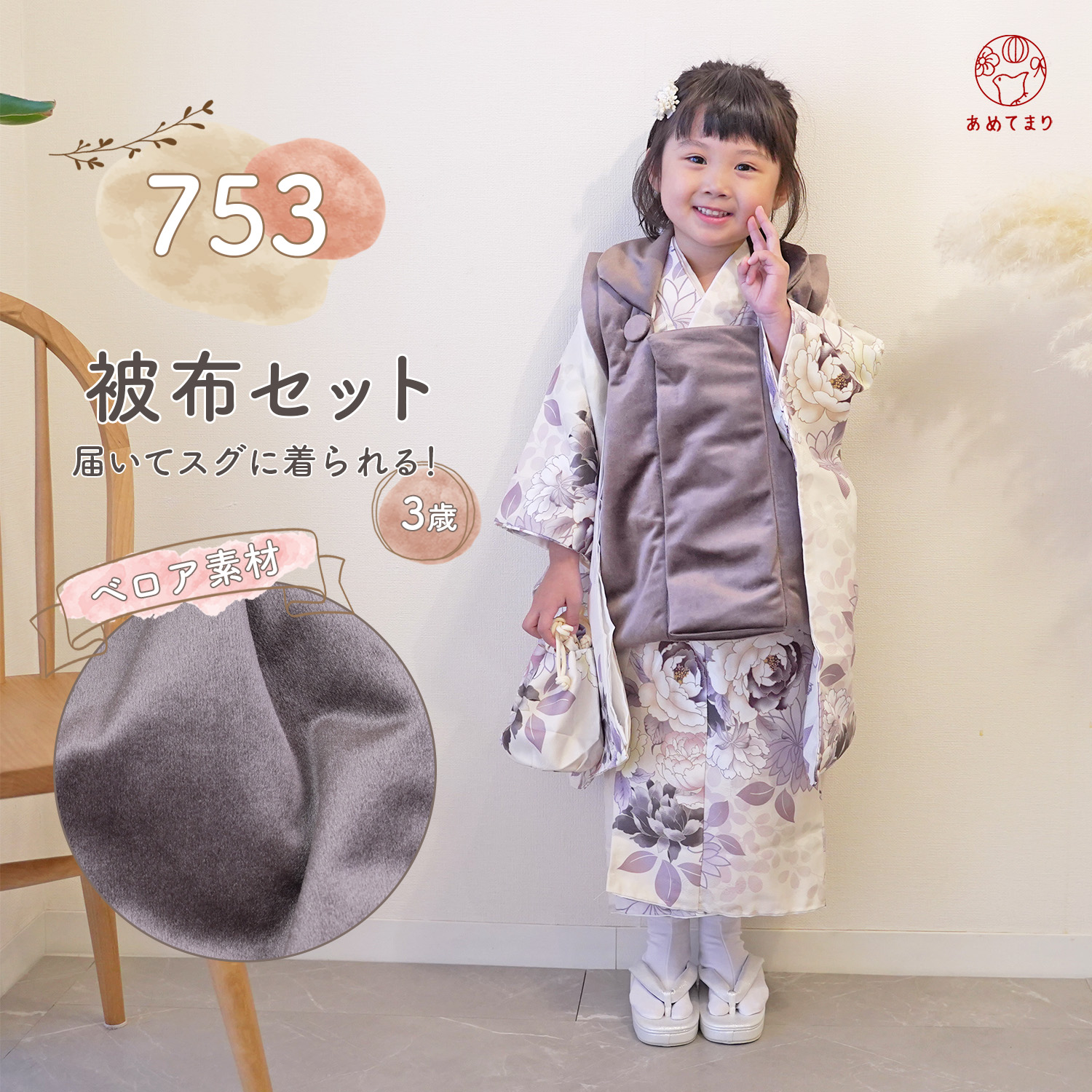 七五三 3歳 着物 被布セット 女の子 ベロア 被布コート 花柄 子供 女児 キッズ 牡丹 くすみ×ニュアンスカラー 7点フルセット【草履 巾着 足袋】